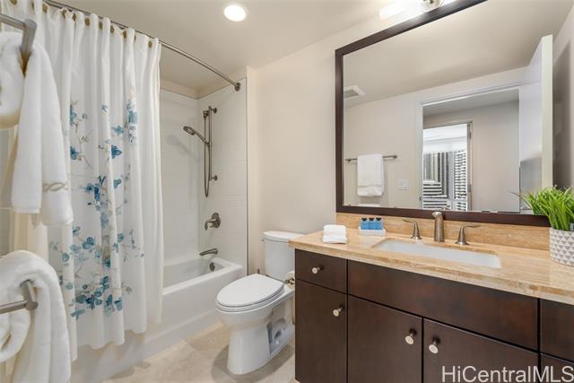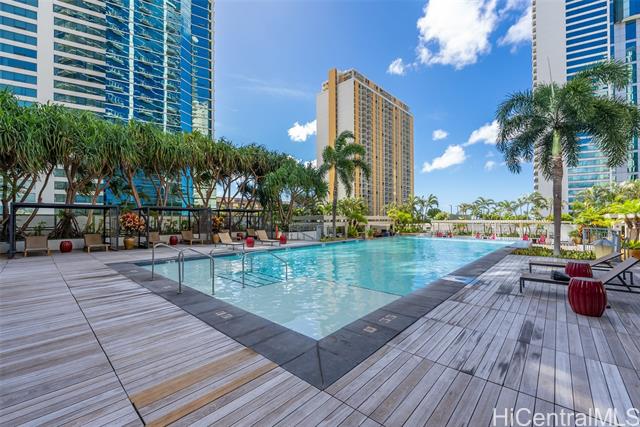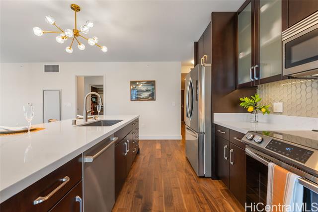 Enjoy the coastal lifestyle of Waihonua - 3 bedroom, 2 bathroom ocean view, corner unit in the prestigious Ala Moana, Ward Village area in the heart of Honolulu. The unit is beautifully upgraded with European designer countertops, new appliances, designer lighting fixtures, fully built-in closet systems, seamless blackout blinds and hardwood flooring! World class amenities include: chef's kitchen in club room, fitness center, yoga and private workout studio, spa, pool, theater, BBQ cabanas & guest suites! All in a perfect location for an active lifestyle, steps away from Ala Moana beach, Whole Foods, shopping & restaurants! 3-bedrooms are rarely available at this great value!