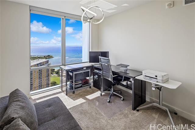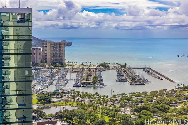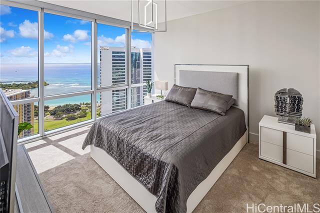 Experience breathtaking ocean and Diamond Head views from this rare 40th-floor residence. Step into a modern home designed for both comfort and style, with floor-to-ceiling windows that fill the space with natural light and an open-concept layout that highlights the stunning vistas. Residents enjoy world-class amenities including a heated swimming pool, whirlpool spa, private cabanas, BBQ pavilions, a stylish club room, theater, lounge, and a state-of-the-art fitness center. Perfectly located just steps from Ala Moana Beach Park and Ala Moana Shopping Center, and one block from Ward Village, this residence offers the ultimate blend of luxury, convenience, and island living. Brand new flooring and new Refrigerator is a plus!