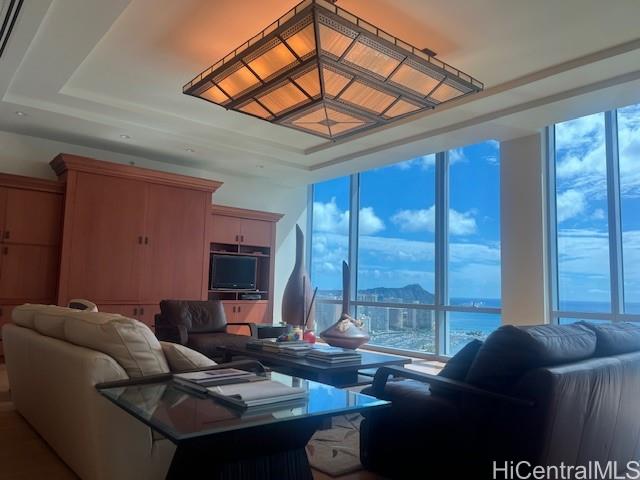 This remarkable residence is located with the prestigious Hokua luxury condominium in Kakaako, Honolulu, Hawaii. The interior living space is approximately 4,422 square feet plus 2,448 square feet (2nd floor and deck) which is currently used to entertain many guests. Alii C is a custom designed and built home, situated on the 40th floor. From every room, you will be treated to an awe-inspiring ocean or mountain view that elevates your living experience. The unit boasts a spacious layout that is impeccable. The views from this unit encompass the Diamond Head, marina and ocean. Property will be sold AS-IS.