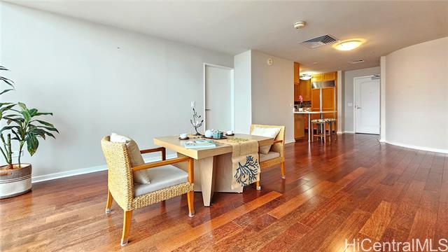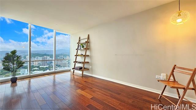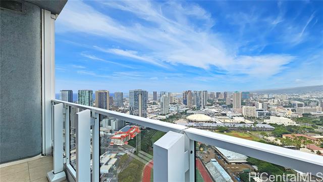 Real penthouse - no unit above! This 2-bedroom, 2-bath, 2-parking penthouse unit features extra-high ceilings and the floor-to-ceiling glass windows that offers beautiful mountain, city, and Honolulu Harbor views without strong afternoon sun! The seller seldom used the central AC. Small, but nice to have some open lanai for fresh air and to enjoy those lovely views. The two tandem parking stalls are spacious and conveniently located near the elevators. Beautiful Engineered hardwood floors throughout. Enjoy an array of amenities, including BBQ area, exercise room, large pool, theater, kids' playground, tennis/pickleball court, putting green, 24-hour security, and more. Moana Pacific is pet-friendly and has 100% hurricane insurance coverage. Residents and the staff are very welcoming and friendly. The location is exceptionally convenient - close to the world-famous Ala Moana Center, Ala Moana Beach Park and the beach, H-1 On/Off ramps, and Ward Village (Whole Foods, movie theaters and restaurants). Enjoy the breathtaking views from your home on the 48th floor!