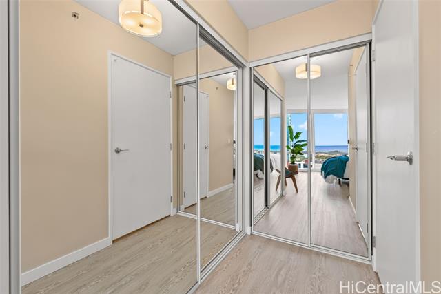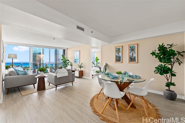 An urban oasis that feels more like a home than a condo. Favored '07 unit with a wide, open layout and bonus room, ideal for an office, theater, storage, or 3rd bedroom. The open design with floor-to-ceiling glass, ensures a bright and airy living space with beautiful ocean views from almost every room. You'll appreciate the central AC and an open lanai, perfect for enjoying your morning coffee or evening drinks while watching sailboats race across the ocean and whales playing offshore in the winter. As day turns to night, the sky transforms with vibrant colors and city lights begin to twinkle. Recent upgrades include new vinyl plank flooring, remote-controlled shades, fresh paint, new refrigerator with craft ice, a new washer/dryer and a new Pure Air filtration system. Conveniently located within minutes to Ala Moana Shopping Center, Whole Foods, Farmer's Markets, hospitals, Waikiki, and restaurants. Arts and culture lovers will enjoy the nearby Blaisdell Arena/Concert Hall, Iolani Palace, and HoMa. Pool, tennis/pickleball courts, 2 gyms, 2 theatres, playground and more, provides a vibrant, social and active lifestyle for you and your guests. Truly, Kakaako's best value!