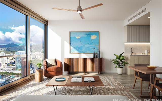Adjacent to Victoria Ward Park and just minutes from Ala Moana Beach Park, The Park Ward Village is enveloped by nature. With ocean views, expansive amenities, and a thriving neighborhood, this is where you want to be. These quality residences were inspired by mid-century design, with Miele and Sub Zero appliances and Studio Becker cabinets. The design team includes Solomon Cordwell Buenz, Yabu Pushelberg, and Vita planning and Landscape Architecture. One or more photos have been enhanced.