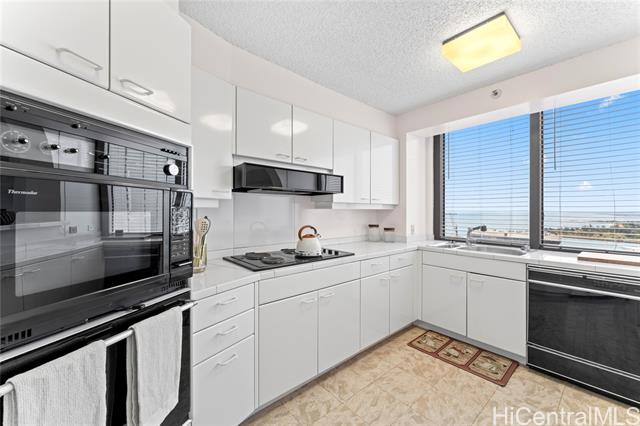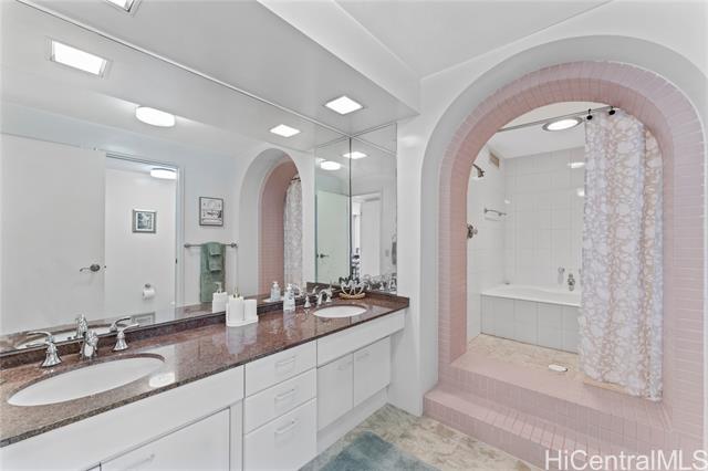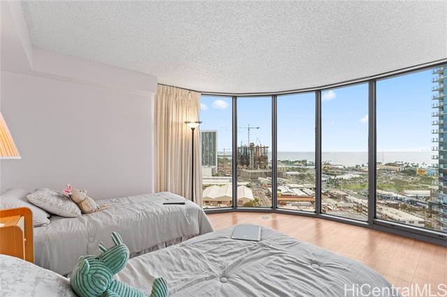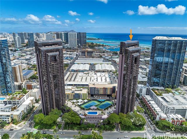 Sweeping ocean, mountain and city views from this 24th floor unit. Gorgeous, cool stone flooring throughout. This is your opportunity to live in the heart of Kakaako at a well established building. Restaurants, grocery stores, coffee shops, gyms, salons, and boutique shopping just outside your door! Building and unit equipped with fire sprinklers. Central AC, cable, internet and Washer/Dryer hook ups in unit. This two bedroom, two bathroom unit with two parking spaces has been lovingly cared for. Furniture negotiable. School zones obtained from Hawaii DOE school finder website. Buyer to verify. Monthly maintenance fee: $2051, Special Assessment: $114, Loan Assessment: $168 Electricity billed at special rate with maintenance fee: Varies but approximately $300 per month