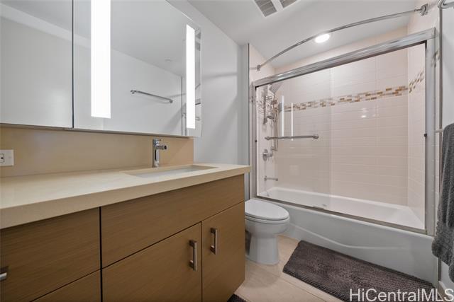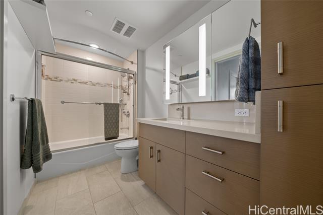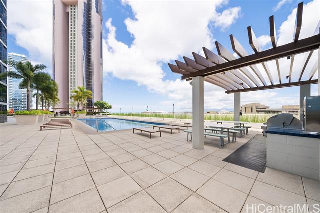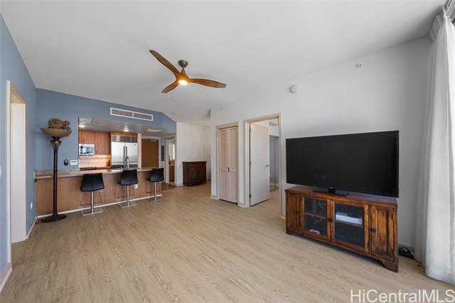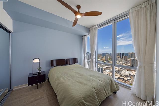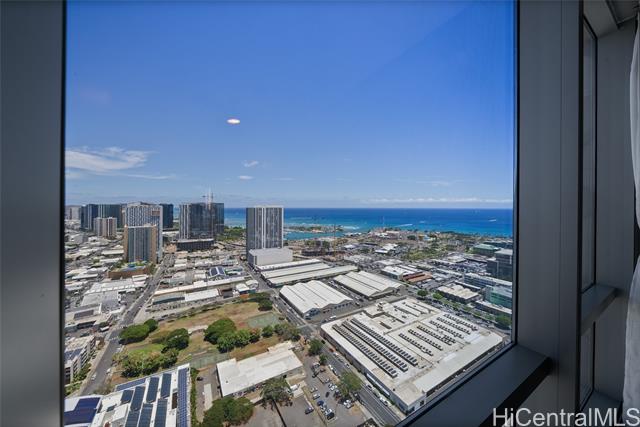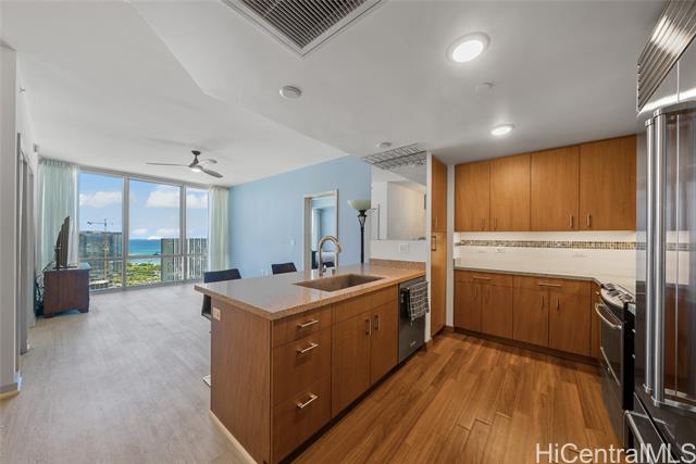 NEW PRICE! Priced Below Assessed Value! Experience elevated island living in this stunning high-floor residence in the heart of Kakaako. Just one floor below the penthouse, this spacious 2-bedroom + den, 2-bath unit offer the best value in the building. Enjoy sweeping ocean and city skyline views from the cooler, more private side of the building. with soaring ceilings and abundant natural light, this home exudes a tranquil, airy ambiance. Thoughtfully upgraded with high-grade laminate flooring, Sub-Zero refrigerator, elegant chandelier, closet organizers, ceiling fans, and double curtains. The flexible floor plan features split bedrooms for added privacy and a versatile den-ideal as a dining area, home office, or reading nook. The generous primary suite includes a walk-in closet. Enjoy two secured covered parking stalls and access to resort-style amenities: heated saltwater pool, hot tub, gym, playground, BBQ areas, and more. This pet-friendly building also offers bike and surfboard storage. Conveniently located near Downtown Honolulu.