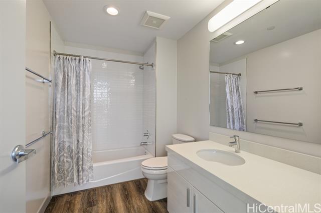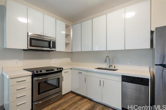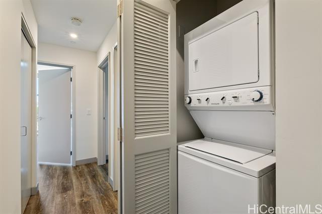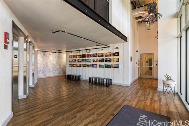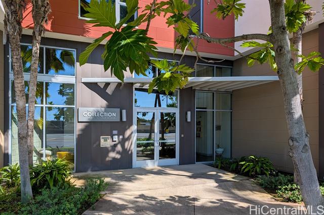Rarely available 2-bedroom, 2-bath corner end unit at The Collection Lofts in Kakaako. This highly sought-after residence is one of only six two-bedroom units in the building—and one of just three offering a private lanai with coastline and sunset views. Boasting 9–10 ft ceilings and an open-concept design fill the home with natural light. The contemporary kitchen features sleek white glass cabinetry, natural quartz countertops, and stainless steel appliances. Brand-new luxury vinyl flooring and fresh interior paint provide a modern, move-in-ready finish throughout. Additional highlights include a separate 23 sq ft ground-floor STORAGE ROOM plus an extra storage locker. Enjoy the rare convenience of two covered, side-by-side full-size parking stalls located near the garage entrance—offering easy in-and-out access without navigating multiple levels. Building amenities include 24-hour security, a pet-friendly community, large private recreation/party room, fitness center, and bike and surfboard storage. Live in the heart of vibrant Kakaako, just around the block from SALT, Starbucks, Down to Earth, H-Mart, UH Medical School, parks, trendy restaurants, cafes, and nightlife.