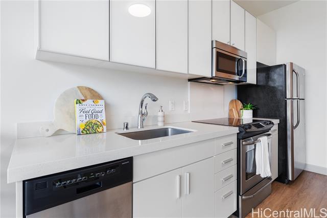 Situated on the desirable fourth floor of the Lofts at The Collection, Unit M416 blends modern design with unbeatable urban convenience. This spacious studio showcases sleek finishes, high ceilings, and floor-to-ceiling windows that fill the space with natural light. Enjoy modern comforts like split AC, motorized shades, luxury vinyl plank flooring, and an in-unit washer/dryer. The kitchen features quartz countertops, glossy white cabinetry, and stainless-steel appliances. This unit includes covered parking and access to a secured, pet-friendly building with top-tier amenities—fitness center, recreation room, and bike/surfboard storage. The Collection offers affordable HOA fees with incredible value, all in a vibrant Kaka‘ako location near SALT, Downtown Honolulu, UH Med School, and more. Urban island living at its finest!
