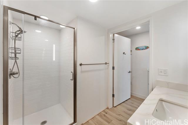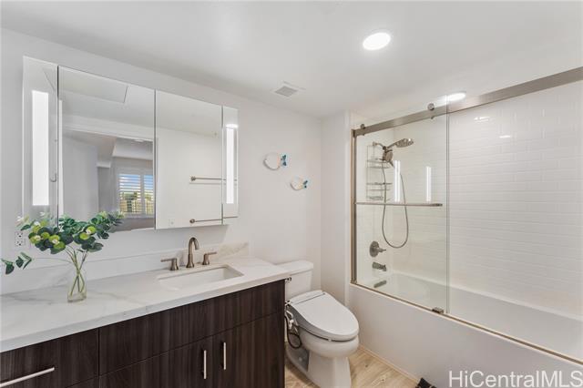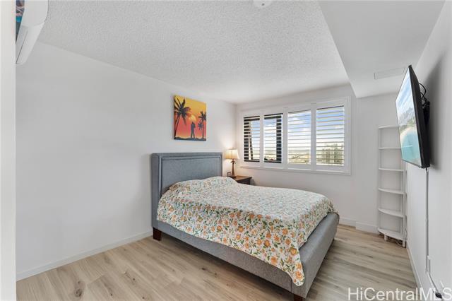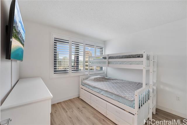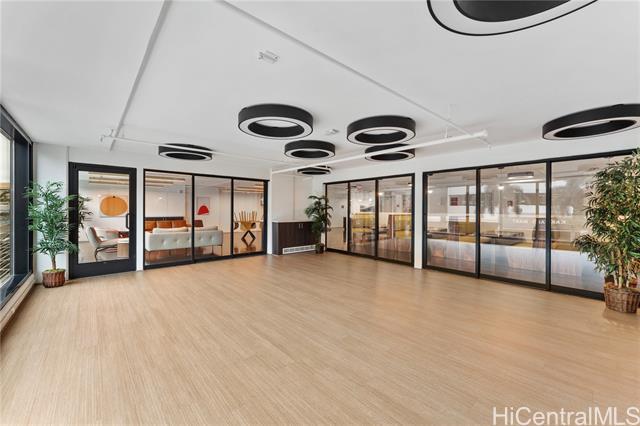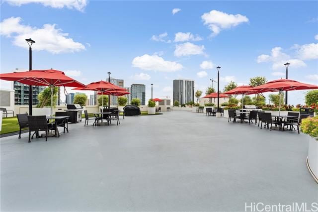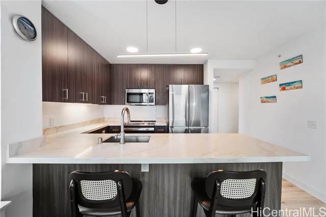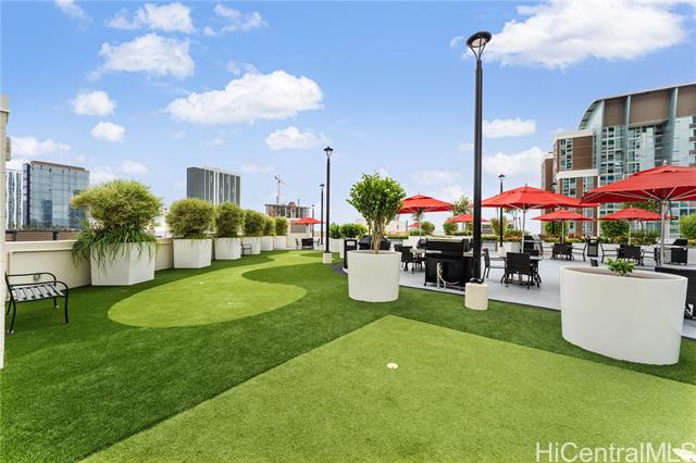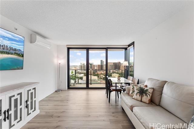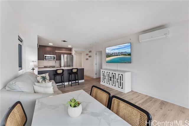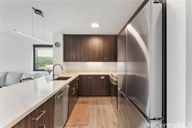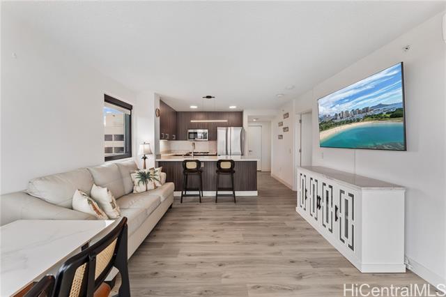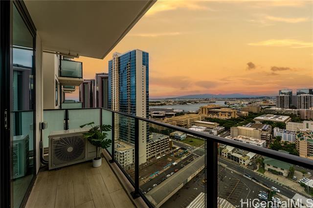 Beautiful Sunset view , Newly renovated 2-bedroom, 2-bath Corner unit with 2 covered tandem parking stalls, located in the heart of Kaka'ako. This newly completed 2024 residence features professional new LVP flooring throughout, tile flooring on the patio, Glass Shower doors, and plantation windows with blinds, creating a clean, modern aesthetic. Enjoy sweeping views of Downtown Honolulu, the lush mountain backdrop, and the iconic Aloha Tower from this well-positioned corner unit. The building offers an impressive array of resort-style amenities, including a multipurpose room, splash pool, BBQ areas, community garden, putting green, outdoor cinema, bicycle and surfboard workshop, and a beautifully designed co-working space.