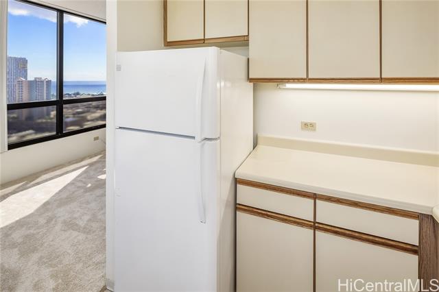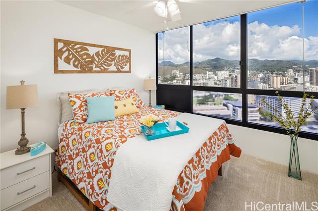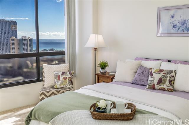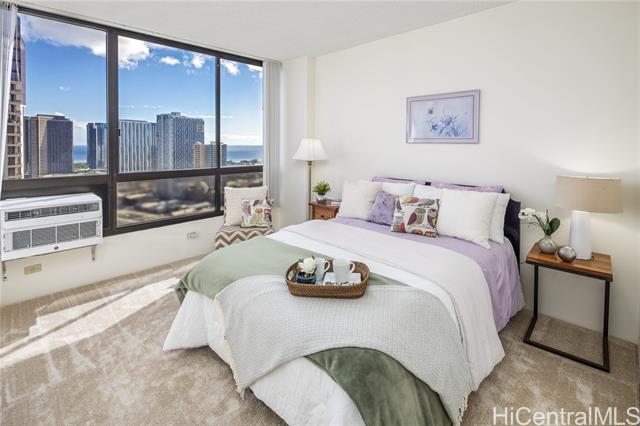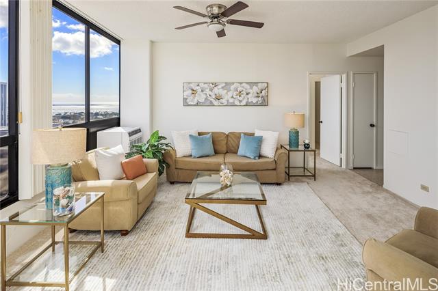 Rarely available corner residence offering panoramic ocean, mountain, and city views from walls of windows that fill the space with natural light. This spacious 2-bedroom, 2-bath condo features high ceilings, refreshing cross breezes, and a thoughtful floor plan with separated bedrooms for added privacy. A welcoming entryway leads into the open living area, ready for your personal updates to create your dream retreat in the heart of Honolulu. Freshly painted with new carpet. Includes one parking stall in a secured garage, conveniently located on the second floor directly across from the building entrance. Sale also includes a separate storage locker. Enjoy the amenities including a pool, spa, fitness center, BBQ area, and convenience store, all within a secure building close to Ala Moana beach, Ward Village, Whole Foods, downtown, movie theater, many dining options, and Ala Moana shopping center. Don't wait to make this property your own.