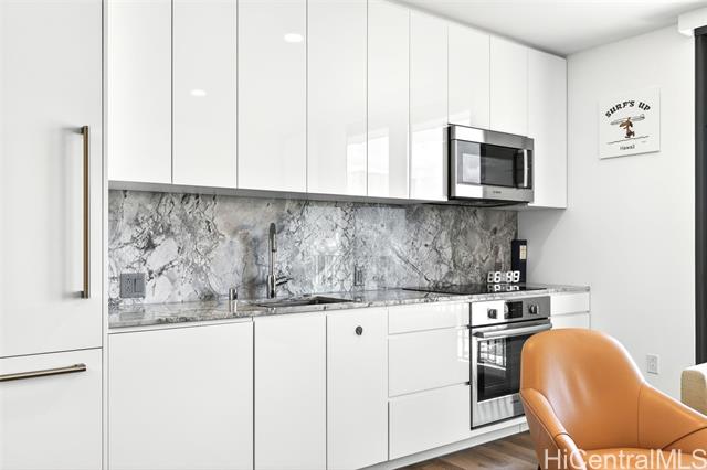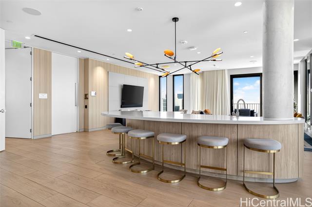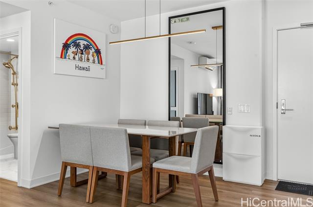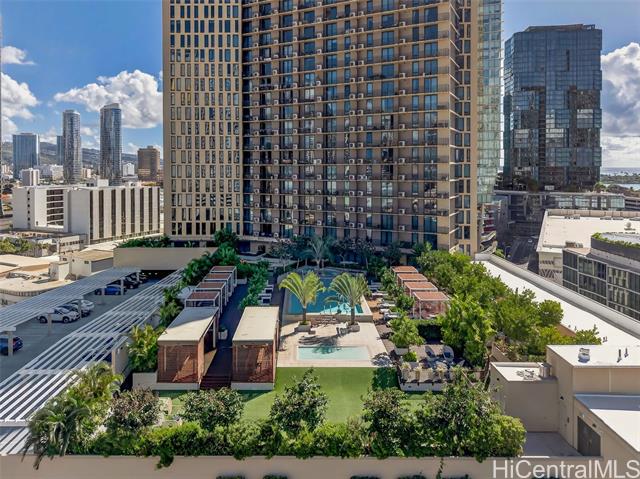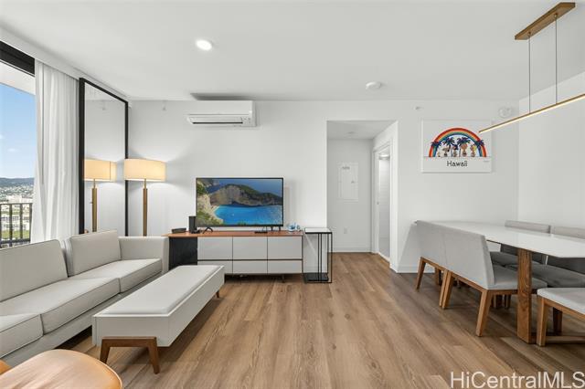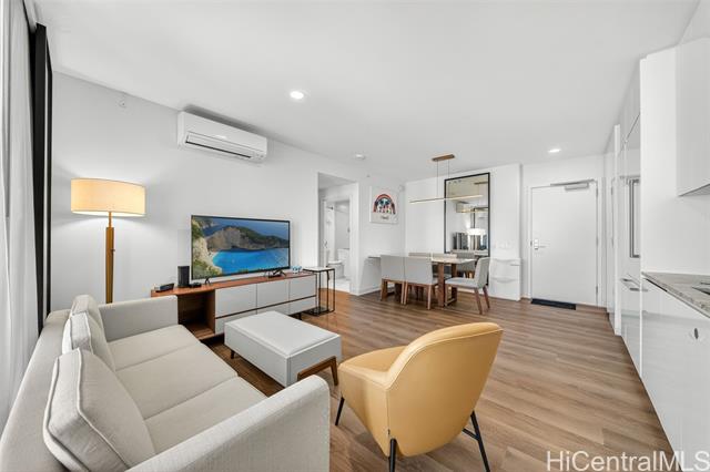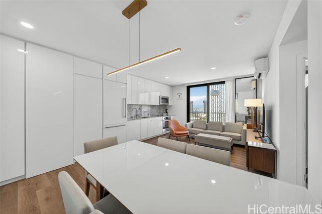 Welcome to Unit 2303 at A‘ali‘i, a modern 1-bedroom residence in the heart of Ward Village. This FULLY FURNNISHED unit offers expansive city and sunset views through floor-to-ceiling windows, filling the home with natural light and island breezes. The open-concept layout features a sleek contemporary kitchen with quartz countertops, modern cabinetry, seamlessly flowing into the living and dining areas. A‘ali‘i is known for its resort-style amenities, including a rooftop sky deck with ocean views BBQ cabanas, fitness center, yoga room. Located just steps from Ala Moana Beach Park, Whole Foods, Ward Village shops and dining, this unit offers an exceptional urban island lifestyle. Don’t miss this opportunity to own in one of Honolulu’s most desirable communities.