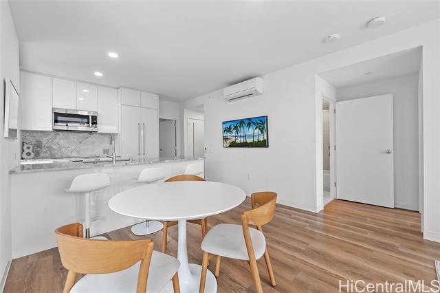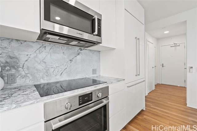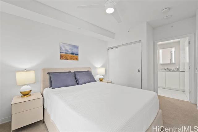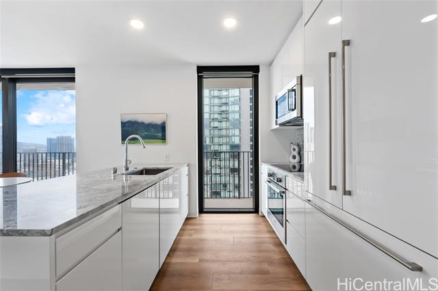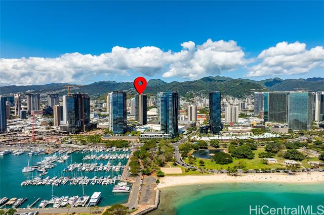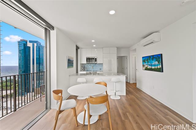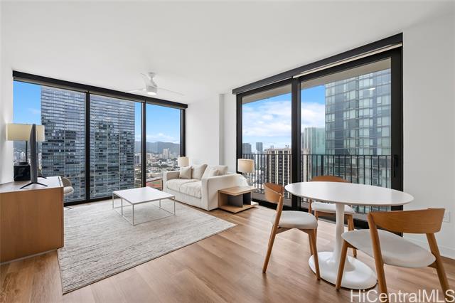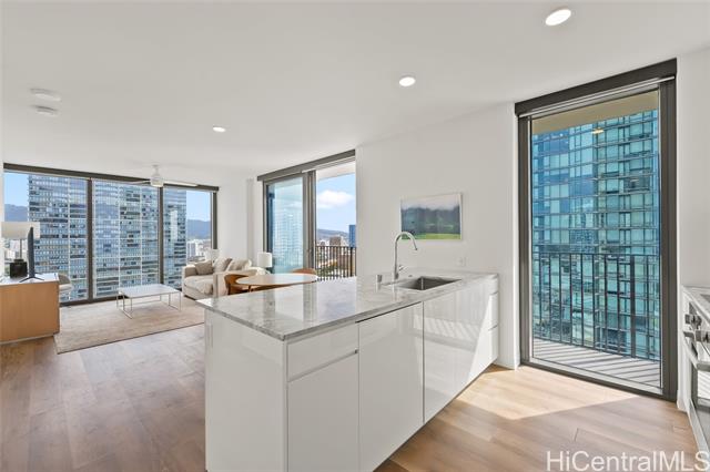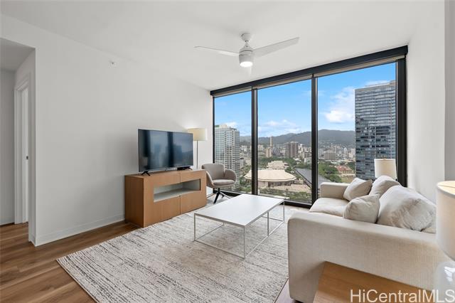 Sweeping views from this rarely available prime corner end-unit in the highly desirable Aalii, featuring one of the building’s most sought-after 2-bedroom floor plans. This residence offers a unique tri-view perspective from the living room with ocean, mountain, and city views—a rare combination made possible by its corner orientation and expansive floor-to-ceiling windows. The layout provides excellent bedroom separation for added privacy, ideal for both everyday living and hosting guests. Step onto the lanai to enjoy ocean views overlooking Kewalo Basin Boat Harbor, adding a dynamic coastal element to the urban setting. This home is enhanced with custom built-ins, electronic blinds, and upgraded storage solutions throughout. Offered fully furnished and turnkey, the residence allows for effortless move-in or immediate enjoyment as a second home or investment. Storage included with the unit. Ideally located within the award winning master-planned community of Ward Village, Aalii offers resort-style amenities and convenient access to beaches, dining, shopping, and Honolulu’s premier lifestyle destinations.