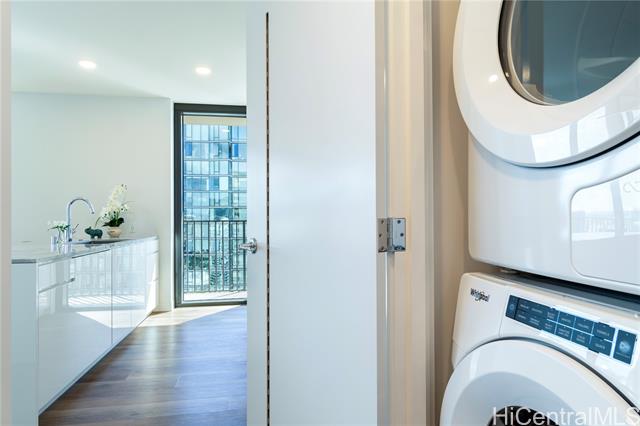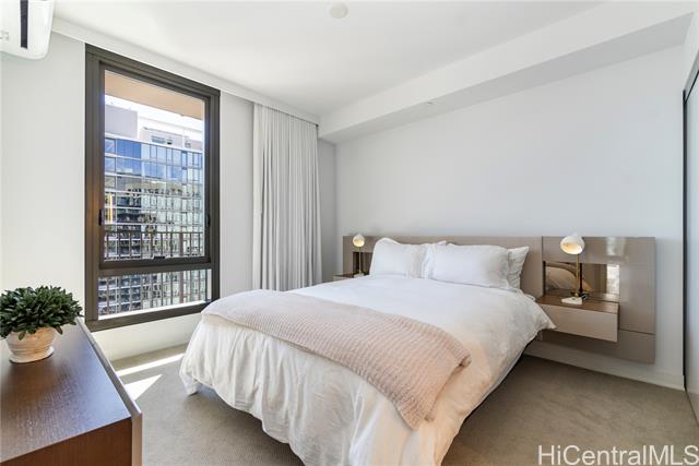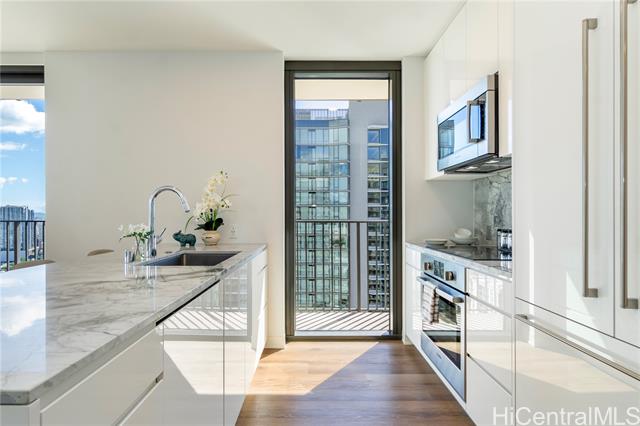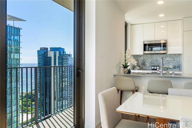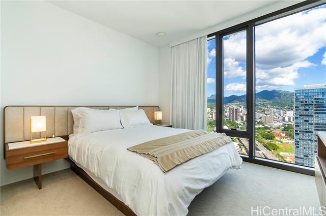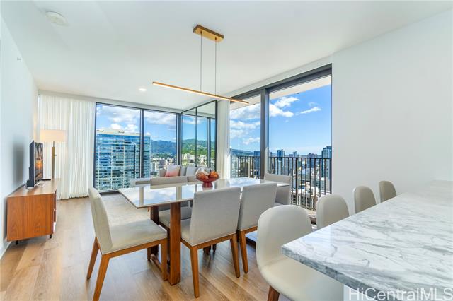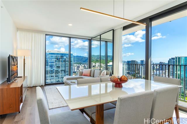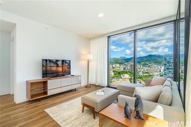 Welcome to A‘ali‘i #3714 in Ward Village, offering sweeping ocean and mountain views from a high floor. This fully furnished corner 2-bedroom, 2-bath residence includes a spacious 127-square-foot lanai, two parking stalls, a private storage room (35sq ft), an additional storage locker, and a dedicated EV charger. Built by Solomon Cordwell Buenz, with interiors by Lauren Rottet, the home features abundant natural light, enhanced privacy, and floor-to-ceiling windows framing ocean and mountain views. The complete Howard Hughes furniture package, refined modern finishes, Bosch appliances, and seamless indoor-outdoor flow create a sophisticated, move-in-ready living experience. Residents enjoy a rooftop sky deck, lap pool, fitness center, theater, guest suites, BBQ areas, and access to Whole Foods. Ideally located near Ala Moana Beach Park, shopping, and dining, this residence is perfect as a primary home, vacation retreat, or investment opportunity.