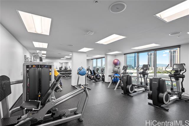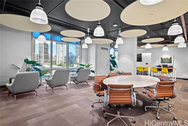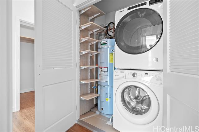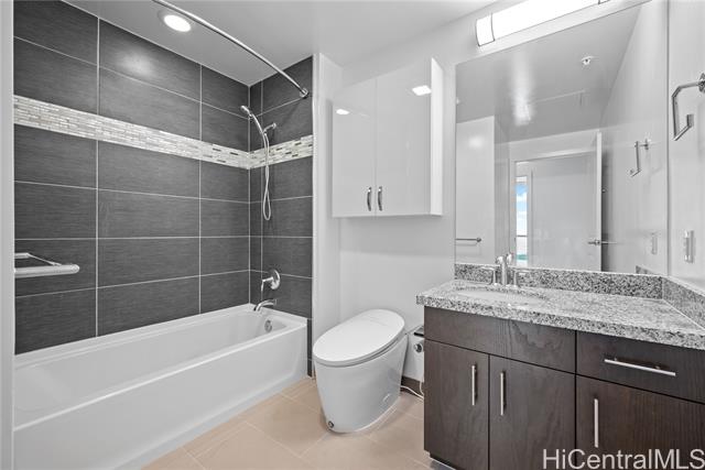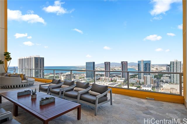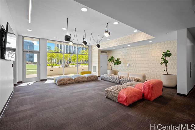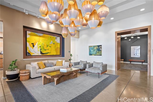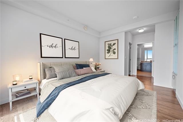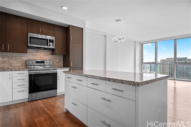 Enjoy Life on the Top Floor! Experience modern urban living in this beautifully upgraded penthouse residence, featuring 9-foot ceilings, luxury vinyl flooring throughout, motorized blinds and custom lighting. The open-concept layout includes a spacious living room, stylish kitchen island with upgraded kitchen backsplash, upgraded bathroom tile and cabinetry, smart toilets, and a custom-built desk and storage system in the primary bedroom. Stay comfortable year-round with split A/C units in every room. Located in the heart of Ward Village, you’re just minutes away from Whole Foods, movie theaters, popular restaurants, and Ala Moana Beach Park. Amenities galore, including a bbq area, recreation and karaoke rooms, conference and theater rooms, outdoor playground, children’s playroom, fitness center, yoga room, and more. Enjoy added convenience with a spacious storage room right down the hall, an additional storage locker on the 3rd floor (same level as your parking), and two full-size, side-by-side parking stalls. Move-in ready—your penthouse lifestyle awaits!