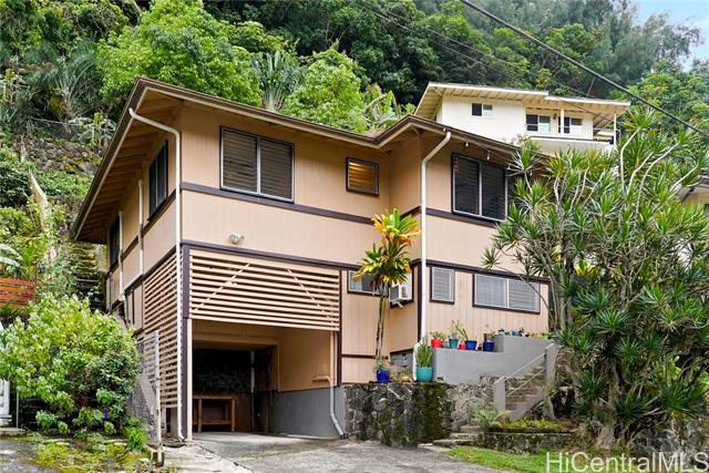 Tucked away in lush Kalihi Valley, this charming 4-bedroom, 2-bath single-family home sits on an expansive 19,035 sq ft lot and offers a peaceful mountain view backdrop. With over 1000 sq ft of interior living space and a terraced lot layout, this property provides room to grow, garden, or expand. The upstairs features a main living area, kitchen, and 3 bedrooms, while the lower level offers a separate entry guest quarters with its own studio (4th bedroom) and bathroom, ideal for extended family or rental potential. Attic space with pull down ladder allows for neatly hidden storage space! Enjoy the convenience of a 1-car carport plus additional driveway parking and extra storage space in the carport. Large covered patio space could be additional outdoor living space or even more storage ,so many options! The property is surrounded by mature landscaping and located in a quiet residential area with easy access to town. Fee simple and move-in ready with lots of potential to customize. No HOA fees and waiting for you to make it yours! Don’t miss this opportunity to own a piece of serenity just minutes from Honolulu.