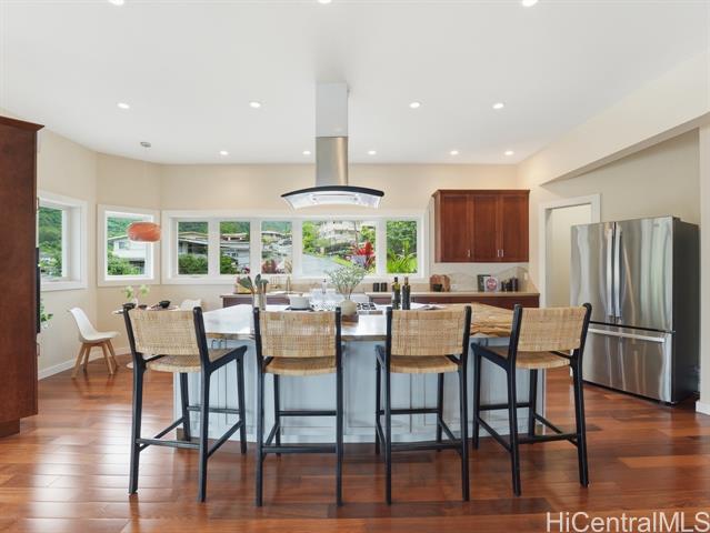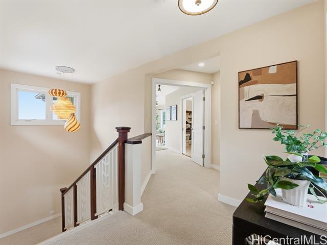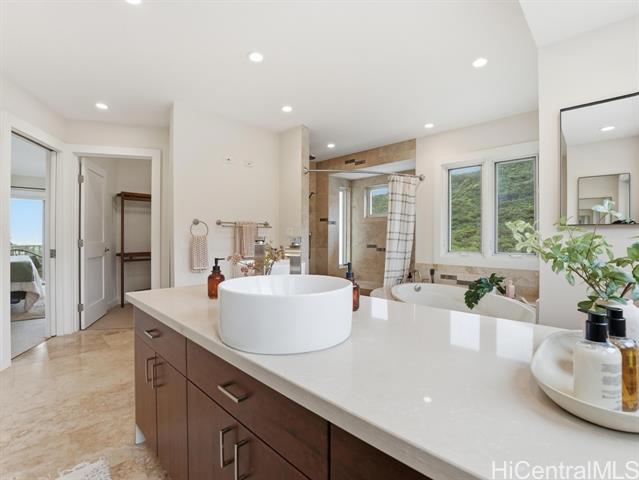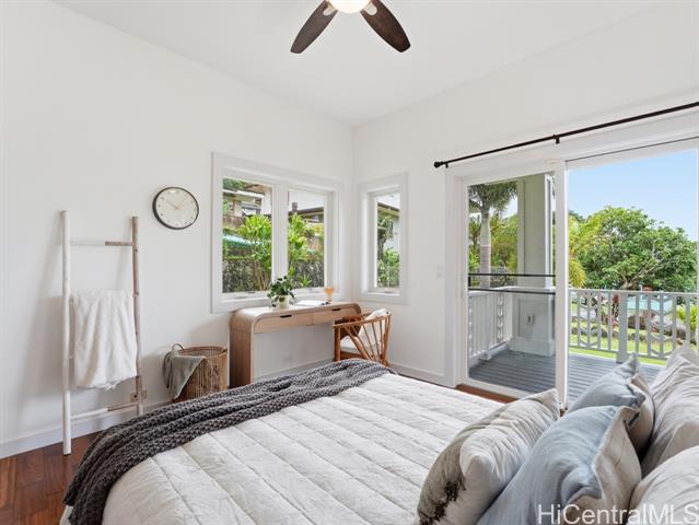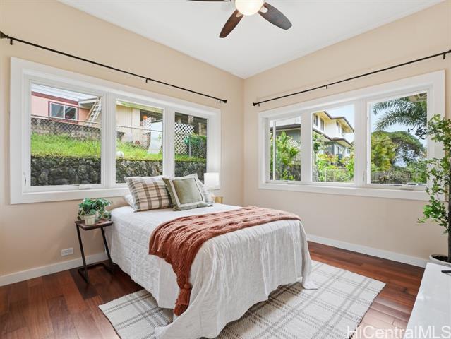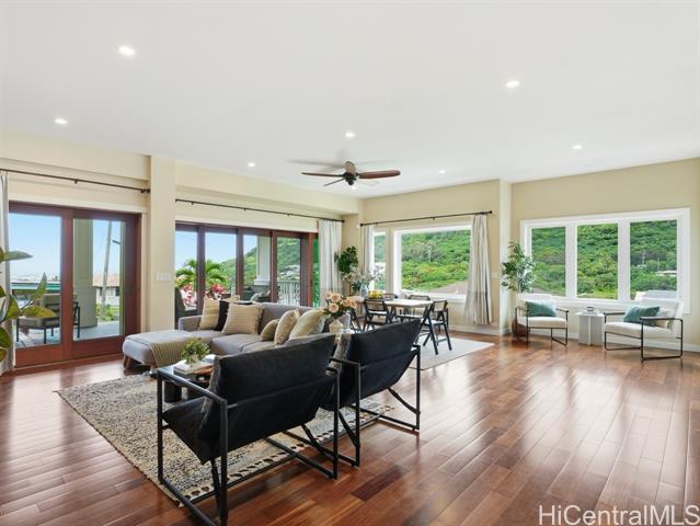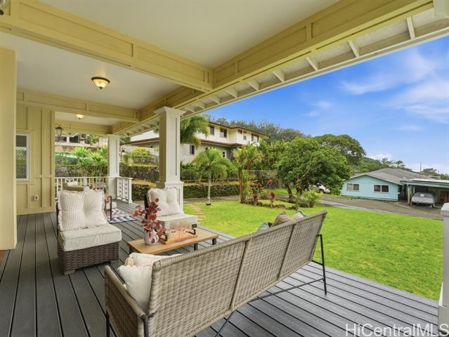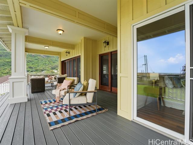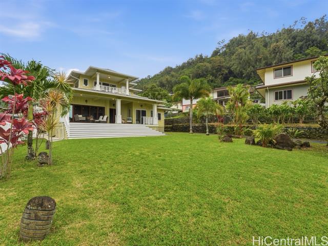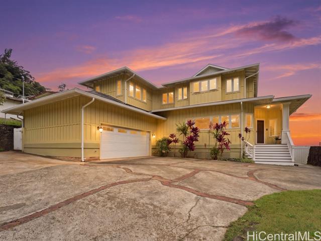 Perched above the rhythm of everyday life, this is the kind of home you return to and truly unwind. Lush green mountains cradle the backdrop, ocean views unfold in front, and the surrounding neighborhood remains peacefully quiet - yet the city is only 10 minutes away. Built in 2012, this 4-bed, 3-bath residence commands a sprawling 10,690sf lot with a generous grassy lawn and a rare sense of seclusion. No neighbors on one side, a private road on another, an elevated position, and a wide street create a natural buffer that is genuinely hard to come by. Inside, soaring high ceilings and gleaming hardwood floors set the tone for a home that is both refined and welcoming. Fresh interior paint and meticulous upkeep speak to the care this home has received. The expansive primary suite is a sanctuary unto itself — a private lanai, a generous walk-in closet, and a beautifully appointed bathroom with a soaking tub and spacious vanity. A hard-wired security camera system provides quiet confidence around the clock. The thoughtfully designed layout places 2 bedrooms & a full bathroom on the ground level, offering a seamless & dignified setup for multi-generational living. Open this Sunday 2-5p