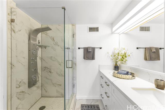 Rarely available high floor ocean view fee simple 2 bedroom/2 bathroom with 2 COVERED SIDE BY SIDE PARKING STALLS! Featuring beautiful ocean, Waikiki and city views. Enjoy the Friday night fireworks and amazing sunsets from your spacious lanai. This upgraded unit offers an open concept kitchen, washer/dryer, extra storage, air conditioning, ceiling fans, newly tinted windows, new refrigerator and much more. Excellent location on park setting with tropical grounds, close to famous Waikiki beaches, Ala Moana Shopping Center, restaurants and the University of Hawaii. The sprinkler/fire alarm system has been completed throughout the building without any special assessment. The Marco Polo offers resort-like amenities which include a wonderful large swimming pool, sauna, tennis, basketball/pickleball courts, BBQ, golf driving nets, a convenience store in the lobby, car wash area, lots of guest parking, storage, 24 hour security,100% Hurricane Coverage with reasonable monthly maintenance fees. Property taxes reflect Veteran exemption. Photos have been Enhanced.