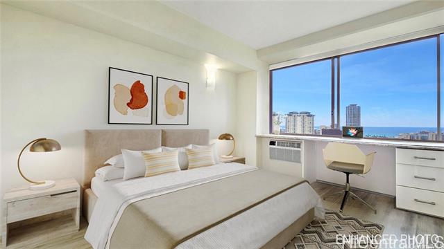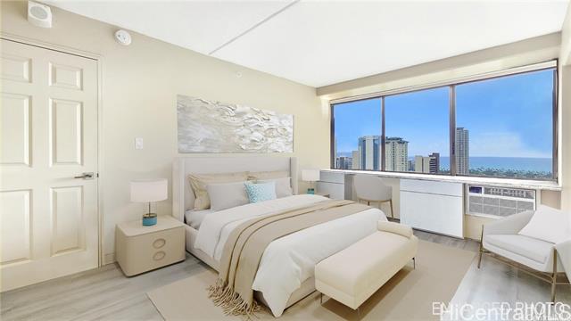 Relax and enjoy a picture-perfect view of the ocean, Ala Wai canal and Waikiki from you lanai! Elegantly remodeled two bedroom and two bath featuring an open concept kitchen with new stainless-steel appliance and granite countertops, a custom-made granite desk in each room, a new living room window A/C, beautiful grayish modern style flooring throughout the unit, with covered assigned parking stall and storage and more. Nice, welcoming lobby entrance and sitting areas surrounded by serene and tranquil private gardens for your guests. Resort-like amenities include pool, sauna, tennis and basketball/pickleball courts, 6 BBQ area, bicycle/surfboard room, car wash area, and convenience store in the lobby. This well-maintained building features fire sprinkler/alarm system and 24-hoursecurity, lots of guest parking stalls, and 100% Hurricane coverage. Close to Waikiki beaches, Ala Moana Shopping Center, restaurants, and the University of Hawaii. Exceptional opportunity to own this beautiful unit. Make it your today!!