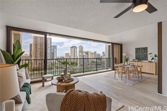 Wake up every day to the beauty of Honolulu in this captivating 1-bedroom, 1-bath home at Kaimana Lanais. With 810 sq. ft. of expanded interior space, the enclosed lanai creates an airy, open layout designed for both relaxation and entertaining. Freshly updated with luxury vinyl flooring, new light fixtures, sleek Corian countertops, and crisp paint, this residence blends modern comfort with timeless island style. Floor-to-ceiling multi-slide doors bring in dazzling views of the Waikiki’s skyline, vibrant city, ocean, Diamond Head, and spectacular sunsets—your personal postcard from paradise. The walk-in shower adds a touch of everyday luxury, while building amenities elevate your lifestyle with a pool, recreation room, surfboard racks, secure entry, and pet-friendly living. Perfectly located in Kapiolani, you’re minutes from Waikiki, Ala Wai Golf Course, UH, beaches, parks, shopping, and entertainment. Move-in ready, meticulously maintained, and waiting for you—schedule your showing today!