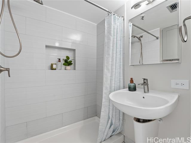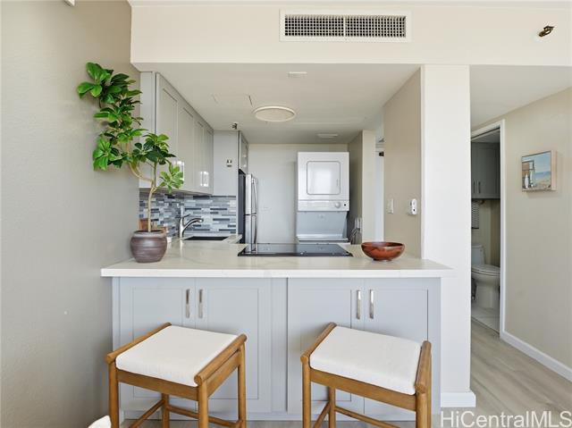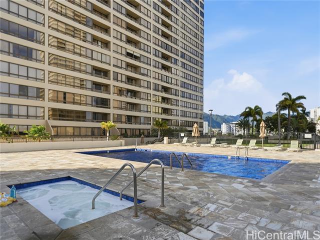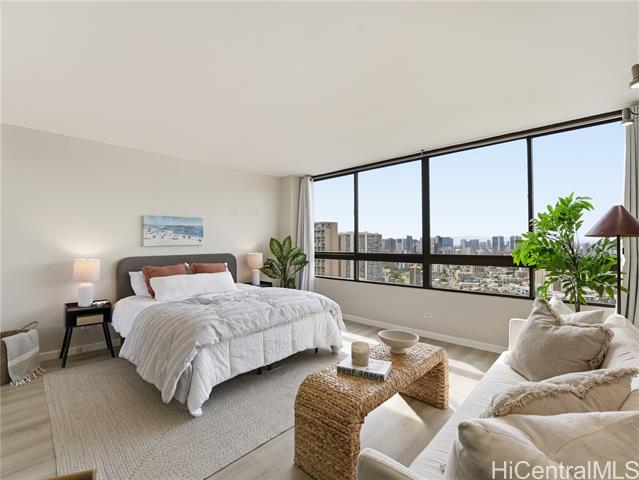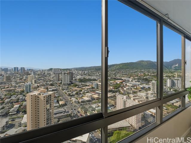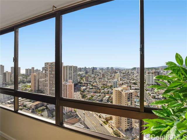 Discover the ultimate blend of chic urban living and tranquil island vibes in this well-priced + beautifully renovated studio on the 32nd floor of Iolani Court Plaza. Enjoy sweeping views of vibrant sunsets, Honolulu city lights, lush mountains, and the ocean—all framed by expansive wall-to-wall windows that flood the space with natural light. Designed with comfort and accessibility in mind, this unit features a sleek walk-in shower, in-unit stacked washer/dryer, central AC, and no stairs required to reach the parking stall. Prime location near Waikiki beaches and numerous dining, shopping, and recreation options just minutes away. This well-maintained building offers an impressive array of amenities designed for both relaxation and recreation, including a sparkling swimming pool, soothing hot tub, sauna, pickleball + tennis courts, BBQ area, and more. With low maintenance fees that cover central AC, electricity, hot water, internet, cable, plus the peace of mind of an nearly-completed re-piping project without any fee increases or assessments, this is a rare opportunity to embrace effortless living at its finest.