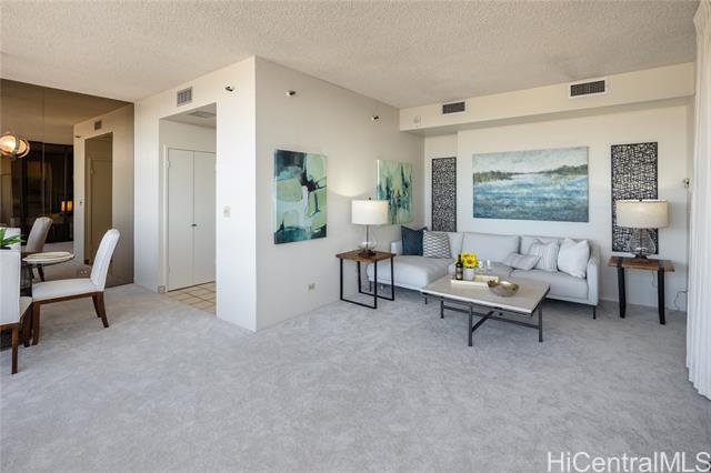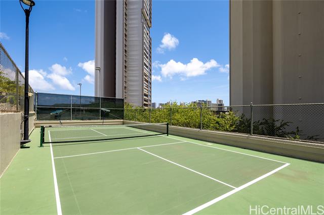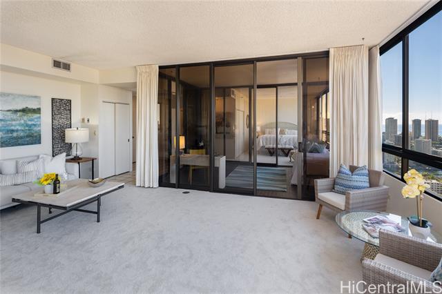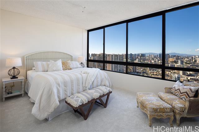 Now is your chance to own this one-of-a-kind, PH unit in Iolani Court Plaza! This unique and spacious 38th floor, 1081sf 1bedroom/1 bath unit comes with TWO full-size, side-by-side parking stalls. The PH floors have high 9’ ceilings, and a gorgeous glass line spans the entire length of this unit to offer beautiful mountain-to-ocean views. A 163sf enclosed glass den can be used as a second bedroom, office or craft studio - or, perhaps open up the space to enlarge the entire unit. Upgrades include brand new carpet, new stainless steel kitchen appliances, and fresh paint throughout. Central AC keeps the unit nice and cool, and electricity is included with the fee. The building has sprinklers to comply with fire safety regulations. Iolani Court Plaza features a variety of amenities - pool, jacuzzi, BBQ grills, recreation room, grassy lounge area, tennis courts, pickleball court and a putting green. The building is conveniently located near restaurants and shopping at Moiliili, McCully and UH Manoa. It is also near the freeway on and off ramps, and by Iolani School.