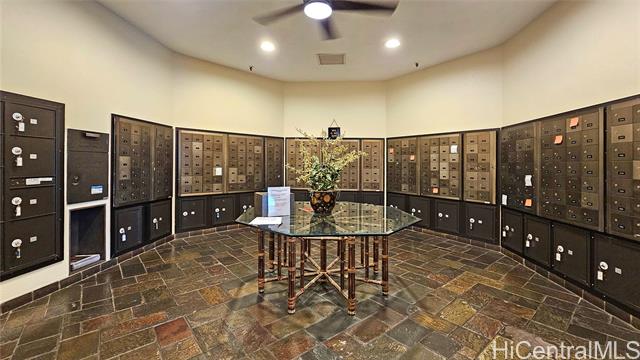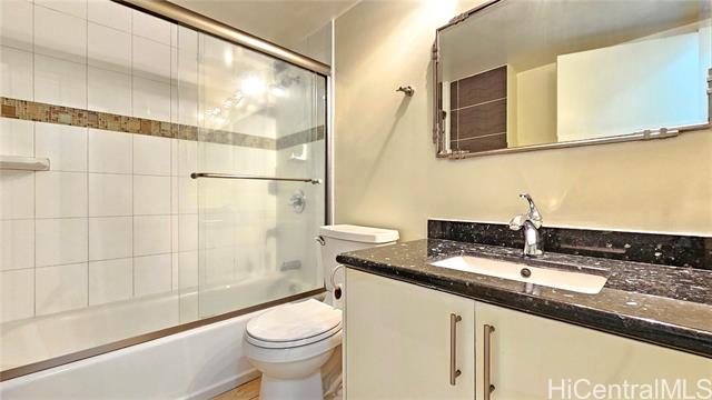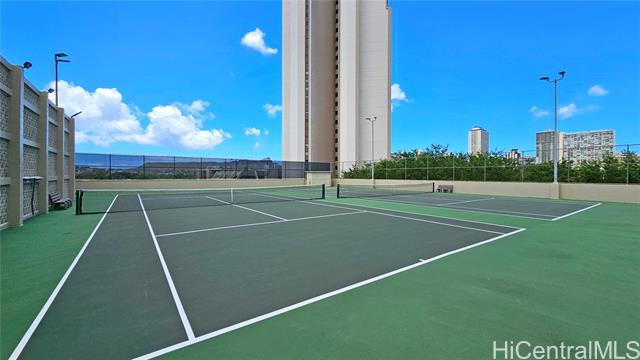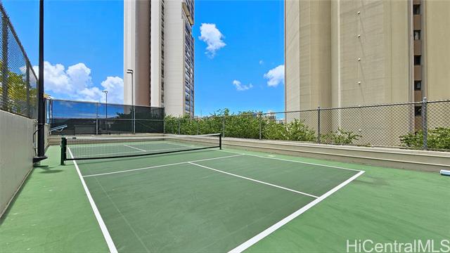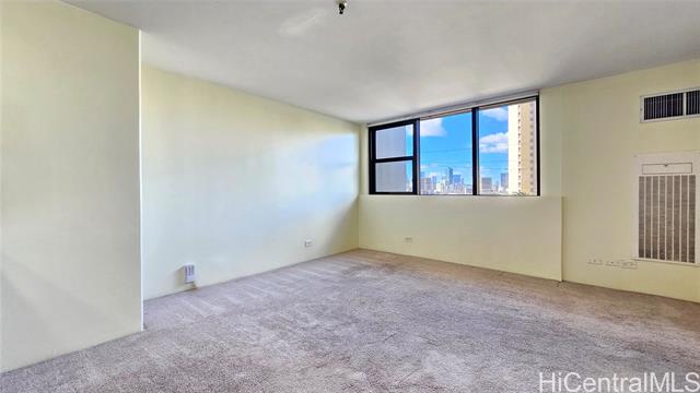 Brand new carpet installed 4/14/2025. Largest 1 bedroom in Iolani Court Plaza. Extra spacious, 1 of only 2 units that are 578 sq ft of interior living space. Brand new paint. Renovated kitchen and bath. Desirable covered secured parking stall on same floor as unit, just exit door on 4th floor hallway. Resort like amenities and central A/C, 25 guest stalls, 2 tennis courts, pickle ball court, pool, jacuzzi, sauna, putting green and car wash area. Fee simple.