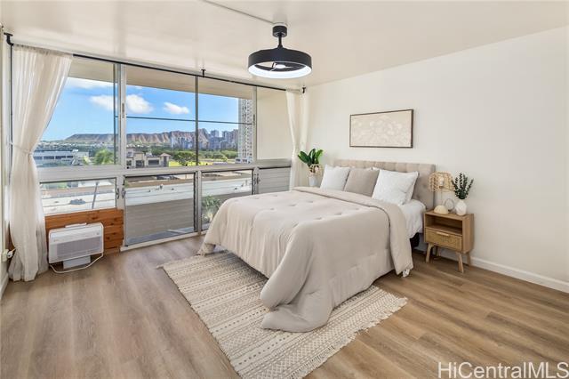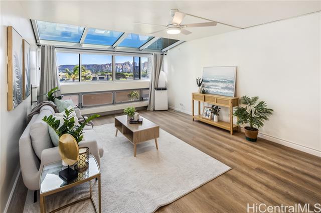 Stunning 2-bedroom, 2 & 1/2 bath home with extended lanai and elegant arched window that frames a gorgeous full Diamond Head view — a rare find! Natural sunlight floods the interior all day long, creating a warm, inviting atmosphere. Enjoy modern comfort with luxury vinyl tile flooring throughout, fresh paint, and no popcorn ceiling (clean, updated finish). Inside, the thoughtful layout offers generous living space, ideal for relaxing or entertaining. As part of Ala Wai Plaza, you benefit from resort-style amenities including a pool, fitness center, BBQ and recreation areas, 24-hour security, on-site resident management, bike & surfboard storage, extra space storage and more — all within a well-maintained, pet-friendly building. Located just minutes from top destinations — whether it’s the beach, shopping at Ala Moana Shopping Center, or the shops and dining of Waikiki — this unit offers the perfect blend of comfort, convenience, and the iconic Hawaiian lifestyle. Don’t miss this bright, tranquil retreat with unbeatable Diamond Head views!