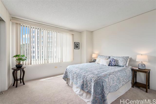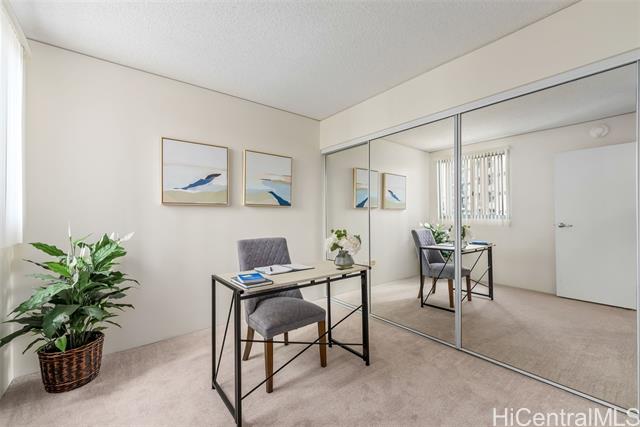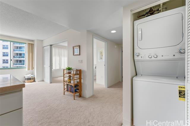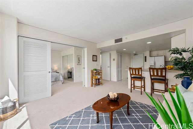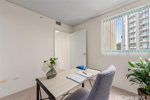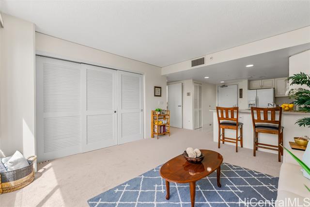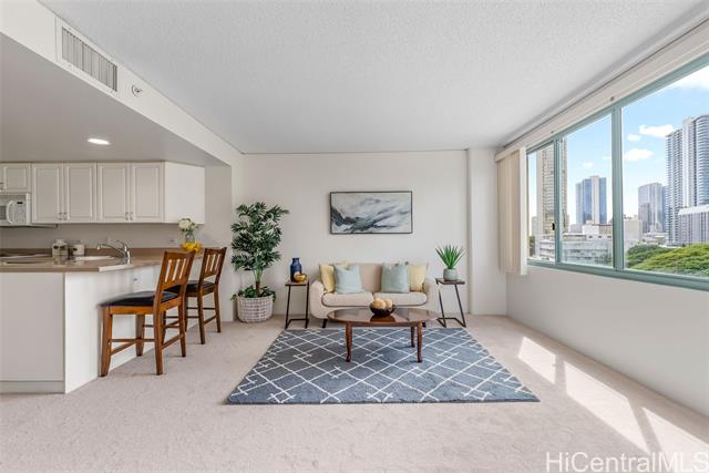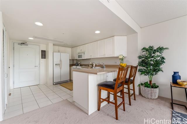 Enjoy the comfort and convenience at One Kalakaua Senior Living. 2-bedroom, 1-bath condo with a wide full-sized parking stall. New carpet and padding installed prior to listing along with freshly painted walls. Featuring an open floor plan with a flexible layout that can be used as a 2/1 or a 1/1 with a large den. Large windows provide plenty of natural light, offering, city, tree top, and green park views. Conveniently located with easy access to so many shopping options, restaurants, public transportation, hospitals, parks, etc. OKSL is a secured building with secured covered parking. Building amenities include a swimming pool, jacuzzi, landscaped outdoor walking paths, library, dining room, hair salon, exercise room, and rec room. Fees / Club Dues include some of the following services - Utilities (central AC, basic cable tv, water, and electricity), security, 1 meal credit / day, weekly housekeeping, wellness, exercise, and social activities.