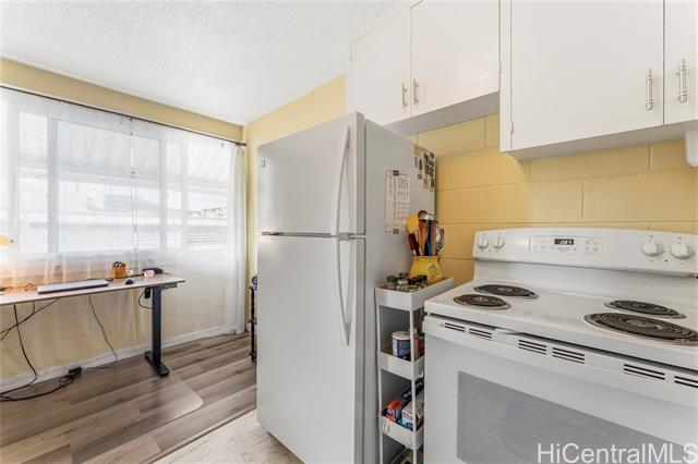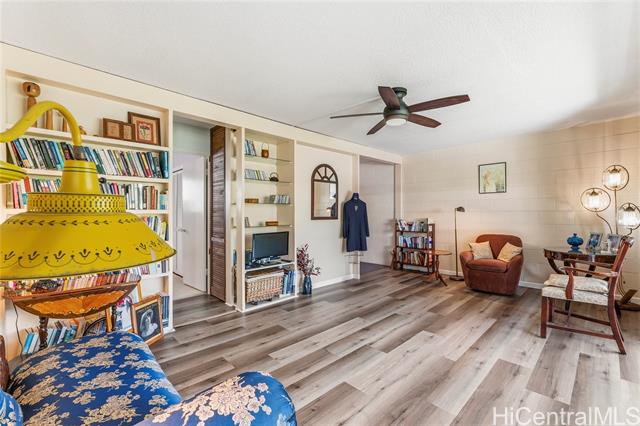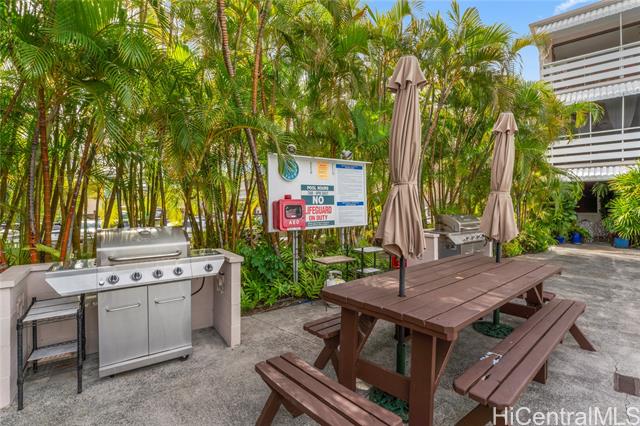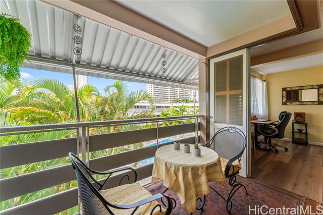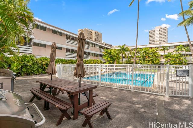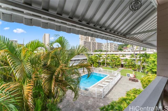 Discover this tropical oasis in the heart of Honolulu—beautifully landscaped with lush greenery and a serene saltwater pool at its center. Conveniently located near Safeway, Ala Moana Shopping Center, UH, schools and hospitals, this top-floor residence (walk-up) offers cool breezes and seamless indoor-outdoor living with sliding louvered doors opening to a spacious lanai. This charming home feels like a cottage and features luxury vinyl flooring (2024), a new range (2024), new water heater (2023), an upgraded kitchen window for enhanced airflow and much more. Enjoy a cup a coffee in the morning on your private & quiet lanai surrounded by lush palms or a glass of wine overlooking the pool when it is lit in the evening ... Simply magical! You will appreciate the unit’s rare, extra-wide entryway with lots of shelving and closet space. Pet-friendly, a great resident manager, and community laundry—this home combines tropical tranquility with urban convenience. 100% HURRICANE INSURED. VA APPROVED.