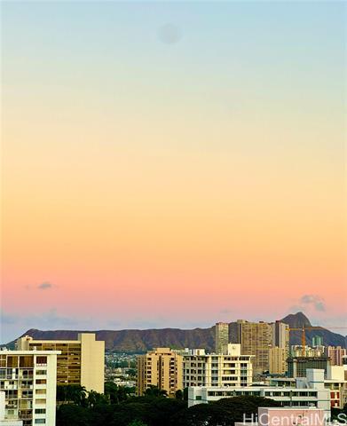 Breezy studio in a prime Makiki location with Diamond Head views from a spacious covered lanai with hurricane shutters. Enjoy morning coffee and evening dinners outdoors while taking in stunning sunrises, warm sunset glow, tranquil moonrises, and sparkling city lights. Thoughtful built-in cabinetry adds both storage and functionality. Ideally located just minutes from restaurants, shopping, schools, beaches, and downtown Honolulu. Well-maintained building with a recently updated pool, sauna, exercise room, and BBQ area—perfect for relaxing or entertaining. Includes community laundry, secure entry, and one assigned covered parking stall. Don’t miss this opportunity to own in the heart of town with iconic Diamond Head views.