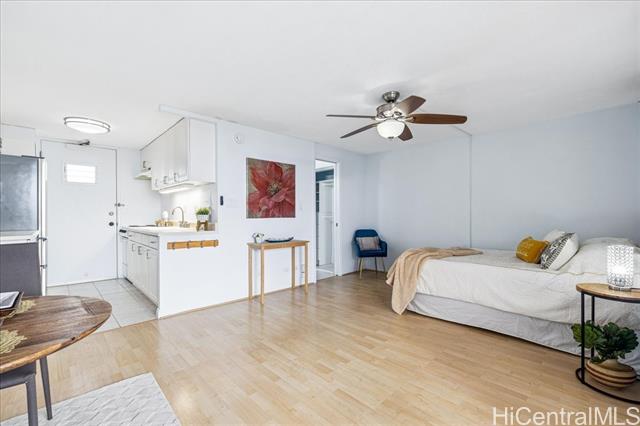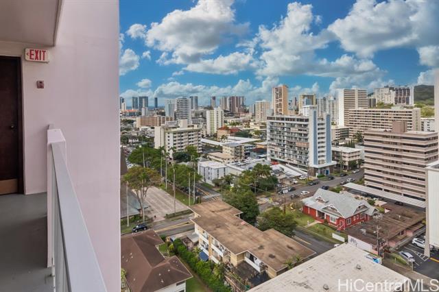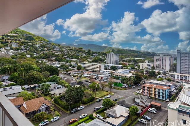 Rarely available top-floor studio with sweeping views! Enjoy iconic views of Diamond Head, lush mountain vistas, and even glimpses and pockets of the ocean as you walk from the elevator to your unit. This spacious studio features laminate and ceramic tile flooring, a stainless-steel refrigerator, microwave oven, ample amount of kitchen cabinets and drawers, and added shelving for extra storage, bathroom has extra storage behind the mirrors, window AC. The generously sized covered lanai is perfect for relaxing, dining outdoors, or simply taking in the beautiful surroundings. Open up the windows to let the trade winds flow through the unit. The well-maintained building offers secured entry, surveillance cameras, an on-site resident manager, and community laundry. Amenities include a pool, BBQ area, sauna, and fitness room for your daily needs and enjoyment. Comes with one covered, assigned parking stall conveniently located near the elevator. Ideally situated near shopping areas, including Walmart, public and private schools, University of Hawaii at Manoa, Makiki District Park, restaurants, beaches, and bus lines. Experience the comfort and convenience of Makiki Living!