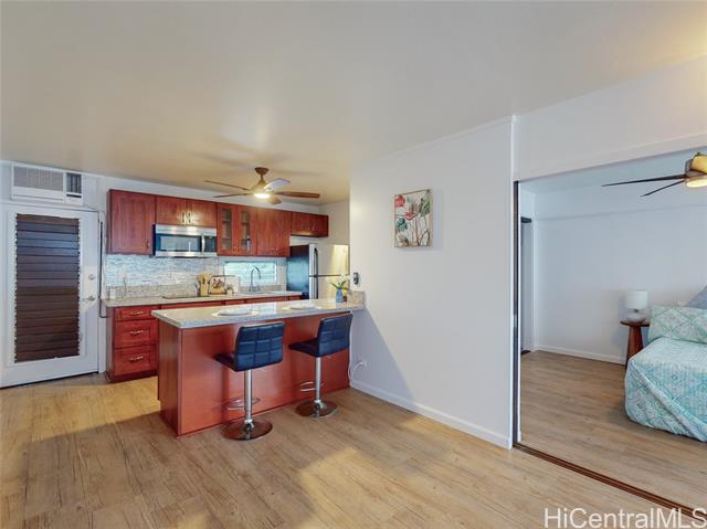 Centrally-located in the heart of town, this boutique condo is a great starter home or investment! Remodeled in 2015 with a new kitchen and bathroom. Kitchen has been updated from its original condition to also include induction cooktop, eat-in island, stainless steel appliances, and enclosed lanai for added interior space. The vinyl flooring and wood cabinets give the interior a warm feeling, while the large windows and cross-ventilation keep the place airy and bright. Punahou Terrace itself feels like a mid-century modern oasis among the busy city, with landscaped courtyard and private pool. It’s also a short distance from Makiki District Park, major bus lines, and freeway access. The unit is located in Building B, which is also tucked into the property, giving you added privacy from Makiki Street and other surrounding buildings. Come see what makes this listing a great place to live and call “home!” One or more photos have been enhanced for this listing.