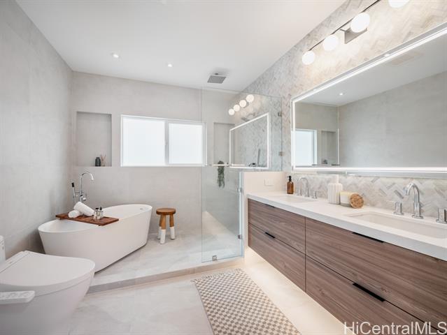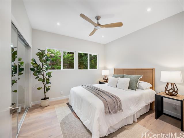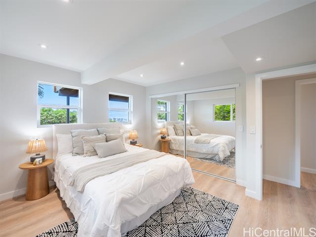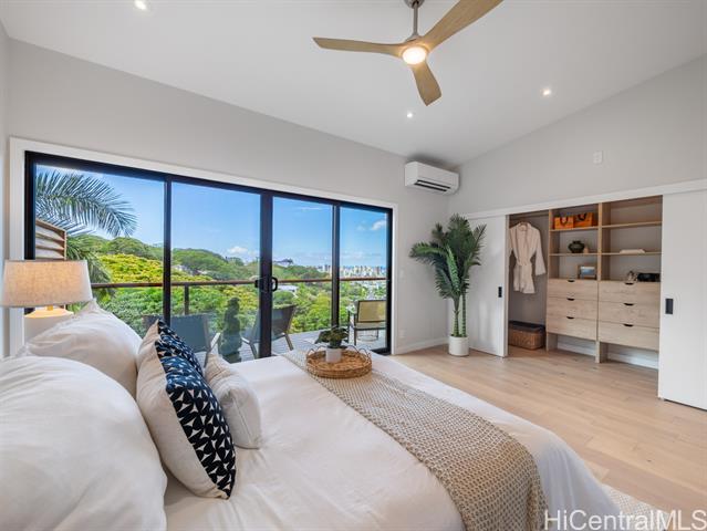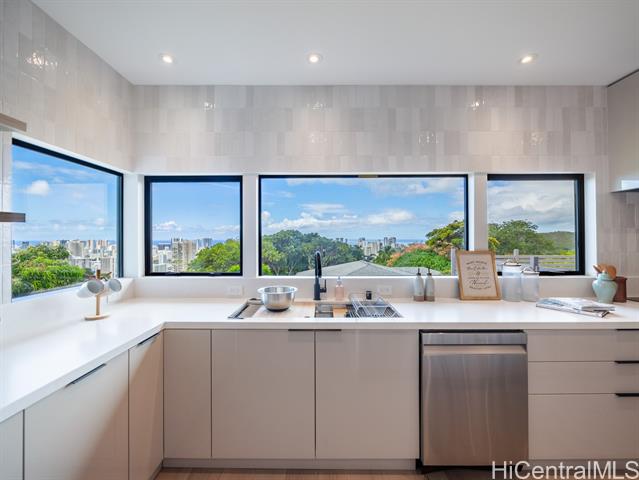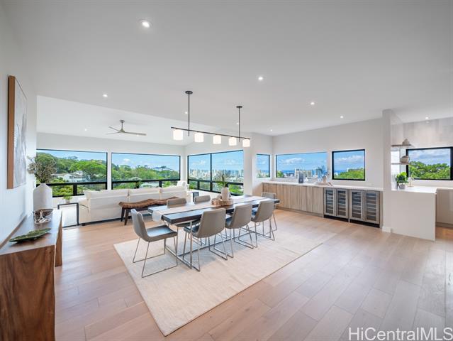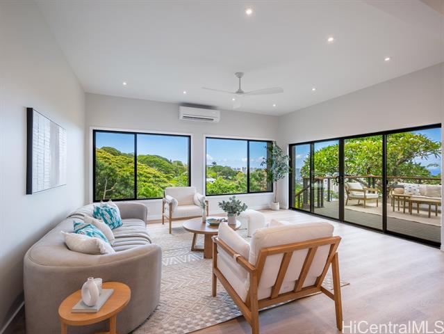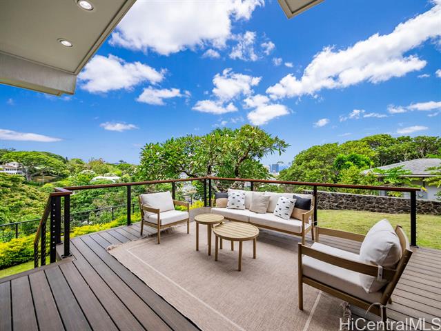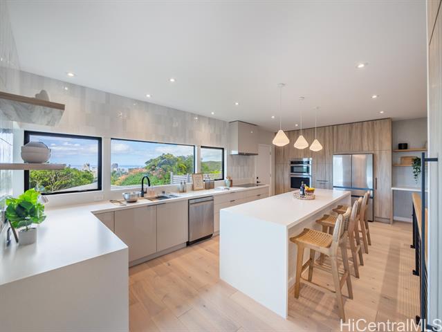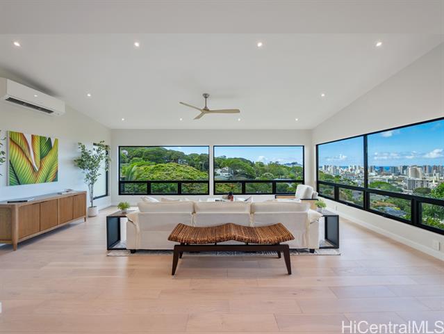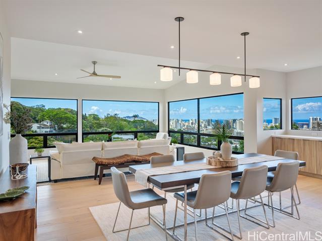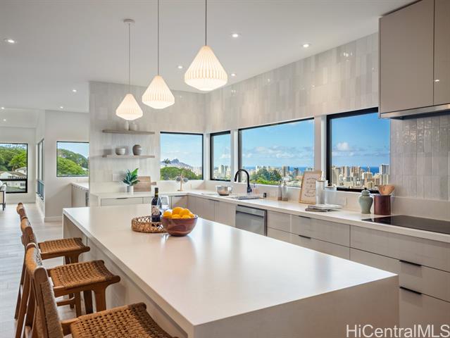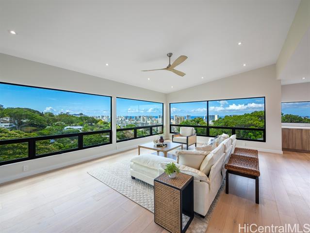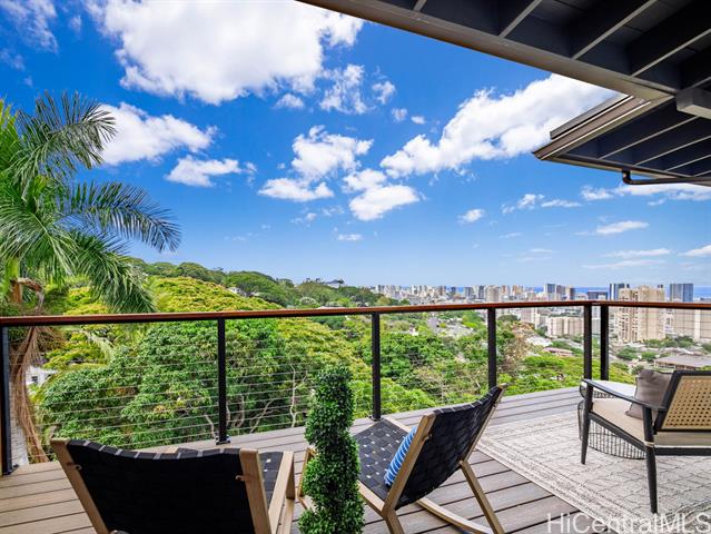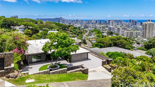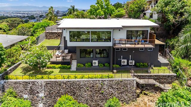 Phenomenal views from this Makiki Heights Midcentury Modern masterpiece! Watch the sunrise over Diamond Head and the sunset over Punchbowl from this fully remodeled home by MCYIA Interior Architecture. Situated on a generous 16,000+ sf lot with rare double street frontage (Kalawahine Place and Mott Smith Drive), the property offers endless possibilities—perhaps add an ADU, pool, or even a pickleball court to the lower portion of the lot. Perched above the city in peace and privacy, yet just minutes to town, enjoy sweeping ocean, city, and mountain vistas. The flexible floorplan features 3 bedrooms and 2.5 baths upstairs plus 2 bedrooms and 1.5 baths downstairs, ideal for multi-generational living or evolving needs. Flat areas for parking and entertaining complement the stunning wraparound views, making this home as functional as it is breathtaking.