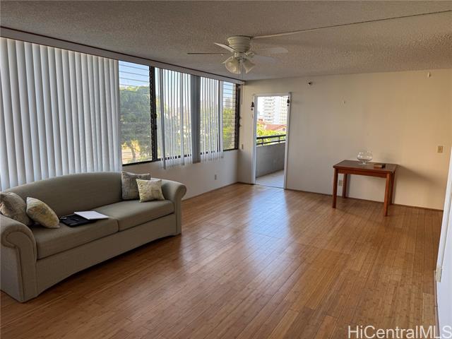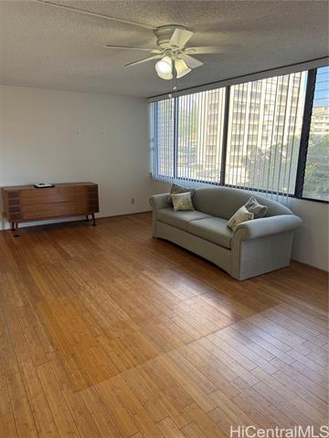 Large 3 bedrooms, 2 Baths 1260 sq ft with a 60 sq ft lanai. Bamboo floors throughout. Ceiling fan in large living room . Cool breezes. Secured highrise in heart of Makiki. 2 covered garage secured parking. Newer Fridge,stove and water heater. Both bedrooms added extra closets. Pool ,BBQ Area and nice ground.s