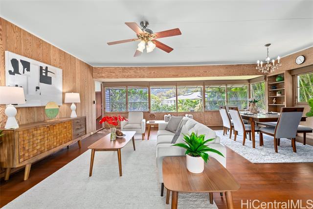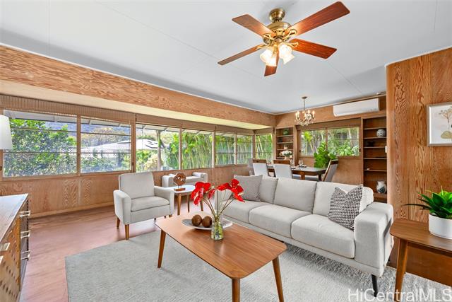 Nestled in the heart of Manoa, this charming 3-bedroom, 3-bath home captures the essence of classic island living with a lush, private setting that truly sets it apart. Surrounded by vibrant tropical foliage, the property’s expansive yard is a rare and exceptional feature. The outdoor space feels like a serene retreat with mature fruit trees, a lovely courtyard, and ample space to relax, entertain, or simply enjoy the beauty of nature. Inside, the home blends timeless character with thoughtful updates. Warm wood accents, including Ohia wood flooring, create an inviting, authentic Hawai‘i feel, while large windows frame majestic mountain views and bring in natural light. The finished lower level provides flexible space for guests, extended family, or a home office. Recent improvements include electrical and plumbing upgraded in 2026, fresh interior and exterior paint, and brand-new carpeting, making this home move-in ready while still preserving its classic Manoa charm. A true sanctuary in one of Honolulu’s most beloved neighborhoods, this property offers the perfect combination of indoor comfort and outdoor living.