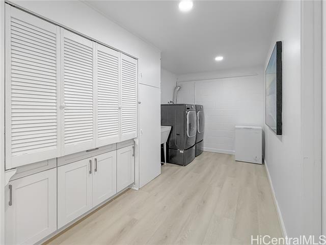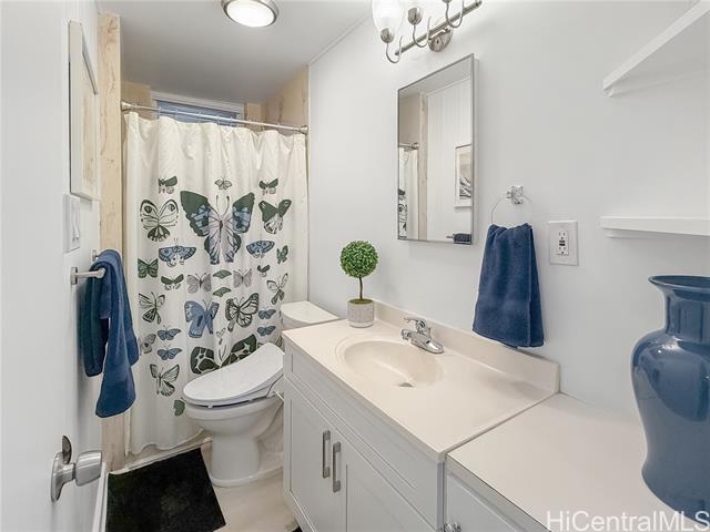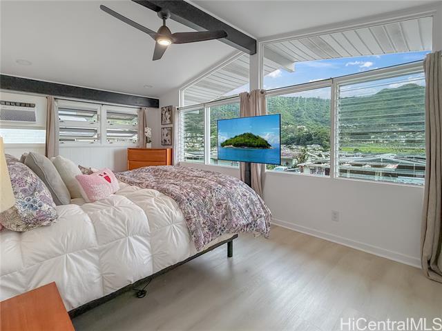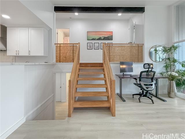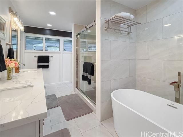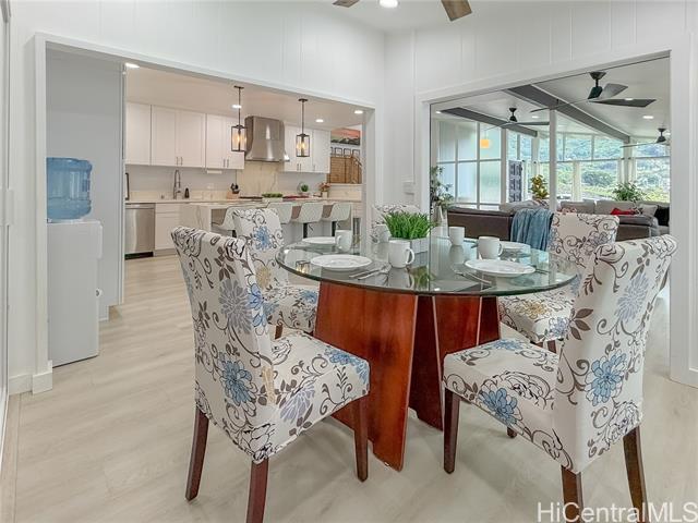 Beautifully renovated 4-bedroom, 2-bath split-level home in desirable Manoa featuring expansive windows, mountain views, and bright open-concept living. Fully remodeled in 2024, the main living area flows seamlessly to the dining space and a designer island kitchen featuring quartz countertops, GE Monogram appliances, and a professional-grade gas range. Ideal for everyday living and entertaining. A spacious bonus/flex room off the kitchen with sliding glass doors offers excellent space for a home office, media room, or additional living area. Upstairs features a private primary suite with walk-in closet and spa-style bath with soaking tub, walk-in shower, and dual vanities. Two additional bedrooms share a full hall bath. Tax records do not reflect all improvements. An additional bathroom was added during the 2024 renovation and is not reflected in tax records. Lower level includes a bedroom with en-suite bathroom offering dual access from the laundry area, plus interior access to a covered two-car carport with storage—providing garage-like convenience. Convenient location near UH, town, shopping, and freeway access.