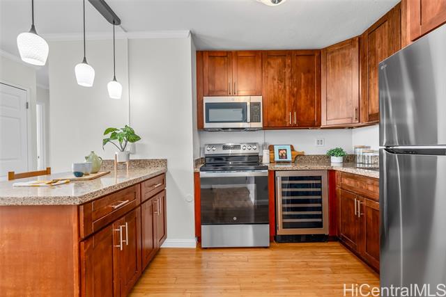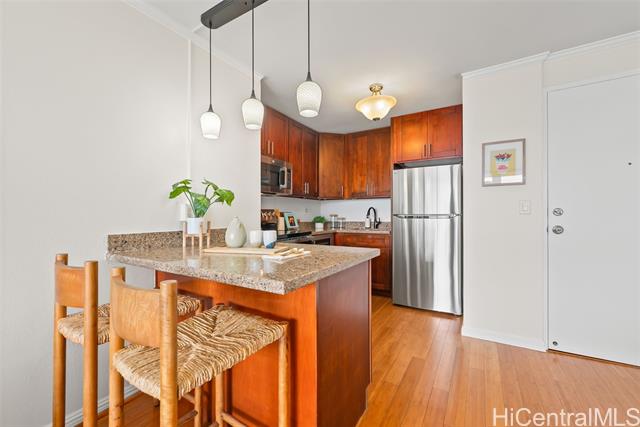 Wake up in a home where everything you need is within reach, from UH Manoa and some of Honolulu’s most sought-after schools to Waikiki, Ala Moana, and daily essentials just minutes away. This renovated 2-bedroom, 1-bath residence blends comfort and convenience with a layout that makes everyday living feel easy, featuring bamboo flooring, granite countertops, and clean shaker cabinetry, all complemented by a smooth, modern ceiling finish. Thoughtful 2026 upgrades bring a fresh feel with brand-new kitchen appliances, including a wine fridge, a beautifully tiled walk-in shower, and new interior paint throughout. Natural light fills the space and extends to a private lanai with cooling cross-breezes and city views, creating a place to relax at the end of the day. Within the community, enjoy access to a pool, BBQ area, garden spaces, and peaceful surroundings with secured entry and an on-site manager. With your parking stall near the lobby, guest parking and quick access to H-1, this residence offers a lifestyle centered on ease, connection, and lasting value in a prime Honolulu location.