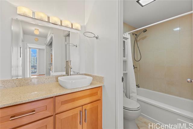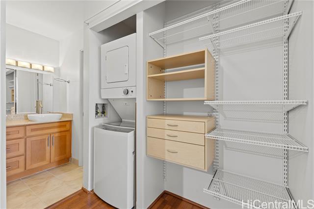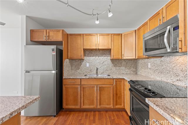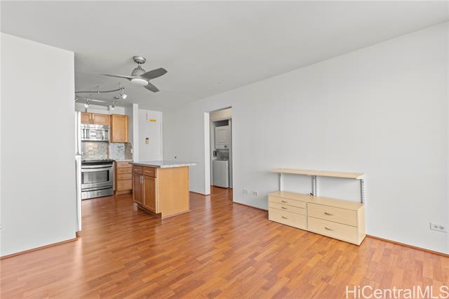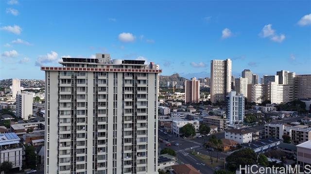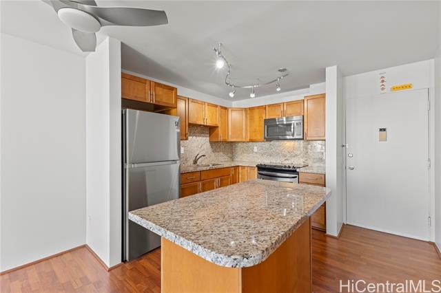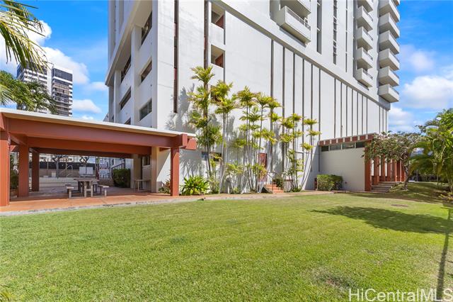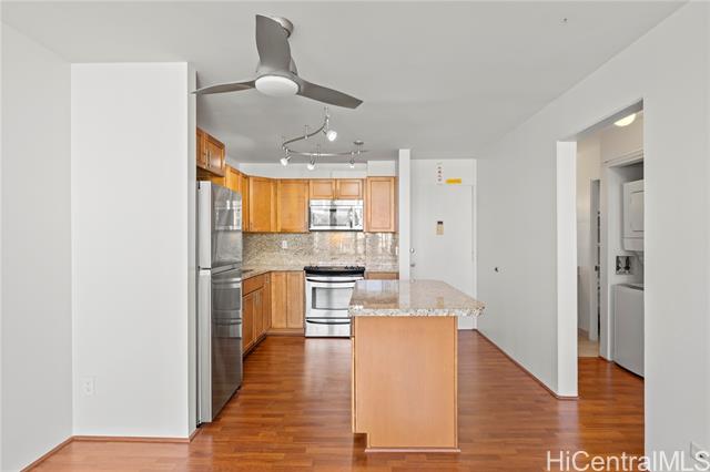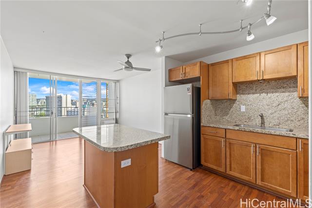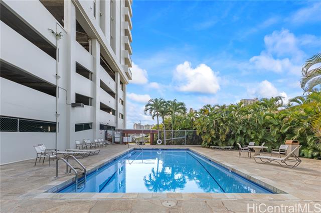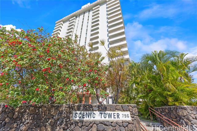 Discover the charm of Scenic Tower, where convenient Honolulu living awaits in the heart of Moiliili. This pet-friendly 1-bedroom, 1-bath residence has an open floor plan with a 56 sf covered lanai and windows allowing natural air flow. Features a beautifully renovated kitchen with granite countertops, ample cabinet space and an island to serve as your dining area. Upgraded with laminate flooring in the living room, kitchen & bedroom and ceramic tile flooring in the bathroom. Enjoy having a walk-in bedroom closet, stacked washer & dryer, along with additional hallway closet space. Relax poolside, entertain in your covered recreation area boarded by a green lawn, and feel at ease with your resident manager Comes with 1 secure, covered parking space. Conveniently located minutes to Waikiki, Ala Moana Shopping Center and the University of Hawaii at Manoa.