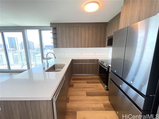 Perched high on the 25th floor, this refined corner residence in Rycroft Tower offers a peaceful retreat above the city. Floor-to-ceiling windows frame sweeping ocean and Diamond Head views, while a spacious wraparound lanai extends your living space into the open sky. Interior features include luxury vinyl plank flooring in both bedrooms, quartz countertops, premium stainless steel appliances, and an in-unit washer/dryer. A quiet split AC system ensures year-round comfort. The resort-style amenity deck features an infinity-edge pool and spa, multiple BBQ and lounge pavilions, a theater room, co-working and media spaces, and a fitness center with yoga studio and sauna. Secure covered parking, EV charging stations, bike storage, pet-friendly policies, and 24-hour security add ease to everyday living. Ideally located near Ward Village, Ala Moana Center, and Oahu’s best beaches, this home offers elevated island living with exceptional convenience. Watch daylight soften into warm ocean tones as sunset colors drift across the skyline and sea. Where modern design and panoramic horizons meet at the edge of the sky.