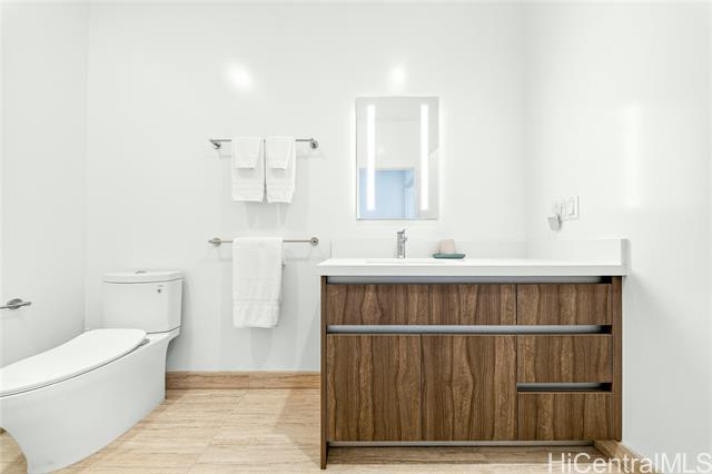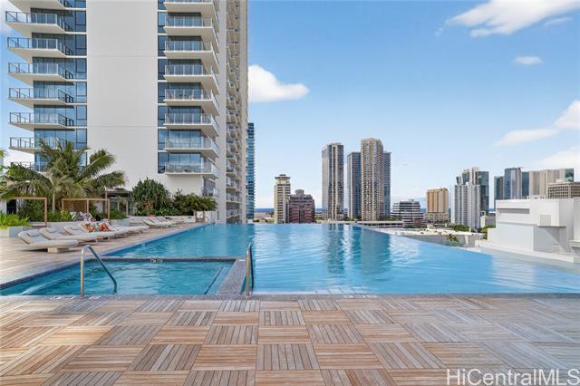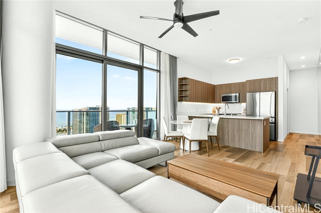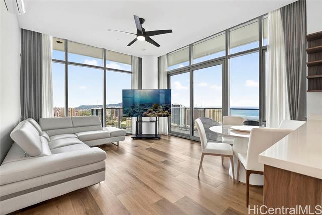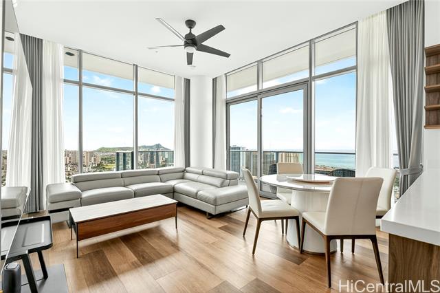 Discover true island modern living in this luxurious penthouse corner residence on the 44th floor of The Park on Keeaumoku. Boasting one of the largest 2-bedroom floor plans in the building, this rare 2-bedroom, 2-bathroom, 2-parking home offers high ceilings, expansive windows, and breathtaking panoramic views of Diamond Head, the ocean, mountains, and dazzling city lights. The open-concept design is complemented by premium finishes and abundant natural light, creating a refined living experience that is both elegant and inviting. Enjoy resort-style amenities including a pool, sauna, fitness center, yoga room, lounges, and beautifully landscaped outdoor spaces, all set within one of Honolulu’s most vibrant and walkable neighborhoods.