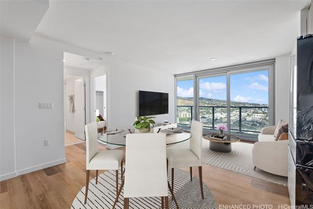 BEST HIGH-FLOOR VALUE!!! One of the best-priced high-floor 1-bedroom residences in The Park on Keeaumoku. Liona #3607 is a brand-new, never-lived-in unit, offering immediate enjoyment of modern high-rise living. This residence features Diamond Head, sunrise, city, and partial ocean views, complemented by floor-to-ceiling windows that maximize natural light and views, along with a private lanai. The open-concept layout is finished with luxury vinyl plank flooring, quartz countertops, modern cabinetry, sleek stainless steel appliances, LED medicine cabinets, and a quiet, energy-efficient split AC system. Resort-style amenities include an infinity pool, spa, fitness center with sauna and yoga room, movie theater, BBQ pavilions, and 24/7 security. Pet-friendly, with one secured, covered parking. This home is an ideal blend of luxury, convenience, and modern urban living. A few photos have been virtually staged(enhanced).