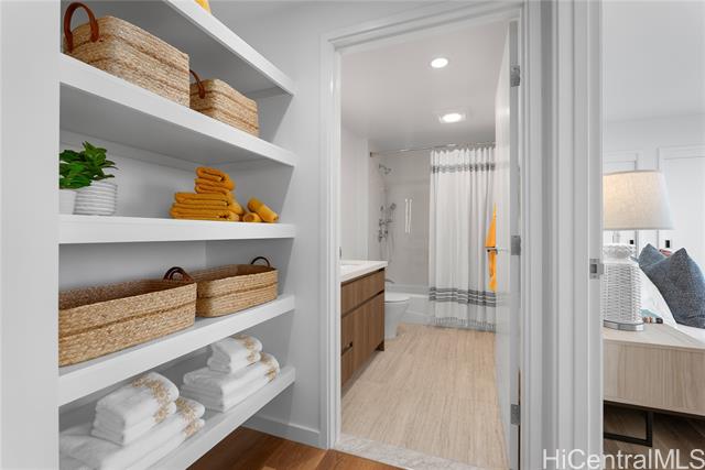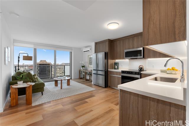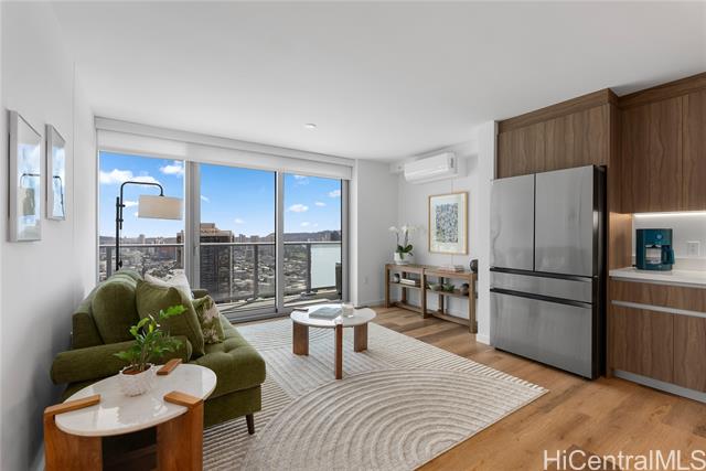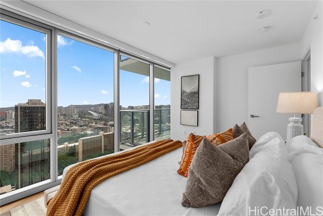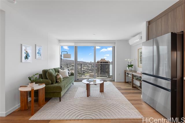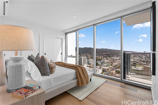 The Park on Ke'eaumoku is completed & resales present an EXCELLENT opportunity to buy NEW without the wait! Located in the Liona Tower, this preferred larger 1-bedroom, "07"unit is move-in ready, INCLUDING FURNITURE, AUTO WINDOW SHADES, HARDWOOD FLOORS! Ideal high-floor unit on the cooler east facing side, with unobstructed, sweeping mountain, Diamond Head, & Waikiki views. Enjoy colorful rainbows on misty mornings as the sun rises, & expansive city lights in the evenings. Wonderful, East facing breezes filter through the unit for those who prefer a fresh atmosphere of Hawaii's clean air! The Park On Ke'aumoku is centrally located in urban Honolulu, within minutes to a wide variety of restaurants, Ala Moana Shopping Center, Ala Moana Beach park, nightlife & Honolulu's lively urban scene. These resort style amenities make this price a bargain: INFINITY POOL, CABANAS, WHIRLPOOL SPA, BBQ PAVILIONS, CLUB ROOM, FITNESS, YOGA STUDIO, SAUNA, CO-WORK SPACES, MEDIA LOUNGE & PRIVATE MOVIE THEATER. As building costs continues to rise, Honolulu's newest residential landmark condominium, offers the perfect first time home, investment or vacation retreat!