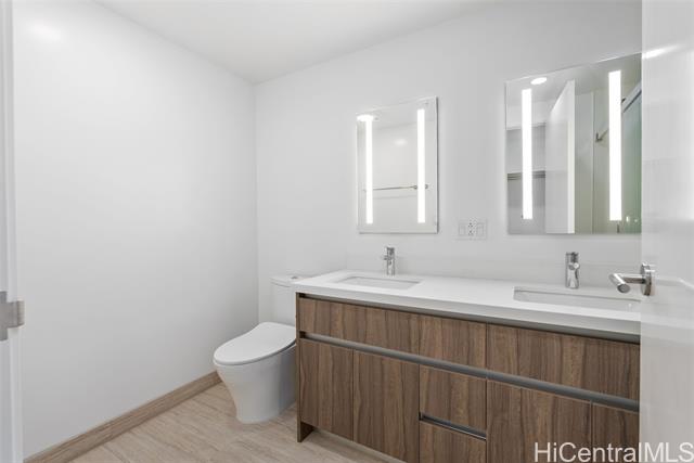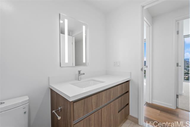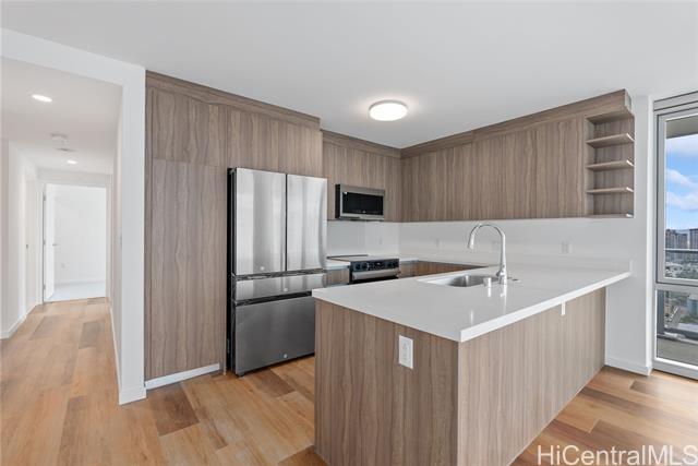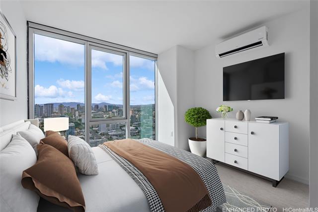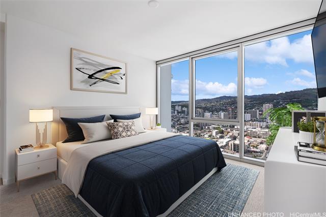 PRICED TO SELL!!! The Park on Keeaumoku’s Liona Tower #3718 is a brand-new 3 bedroom, 2 bath residence with 1,147 sf interior and a rare L-shaped wraparound lanai (186 sf) showcasing 270° views—South Shore Ocean toward Ala Moana, the full Ewa coastline, mountains, sunsets, and even eastward toward UH with a peek of Koko Head. Situated high on the preferred 18 stack, this home is one of only 40 3-bedroom/2-bath units across both Liona and Rycroft Towers, underscoring its rarity and value. The open layout features floor-to-ceiling windows and luxury vinyl plank flooring that maximize light and views. The kitchen offers quartz countertops, stainless steel appliances, and designer fixtures, while bedrooms include plush carpet. Bathrooms are finished with quartz and LED medicine cabinets. A quiet, efficient split AC provides year-round comfort. Pet-friendly and secure, the building offers resort-style amenities: infinity pool, spa, movie theater, fitness center with sauna and yoga room, BBQ pavilions, landscaped decks, 24/7 security, covered parking, bike storage, and EV charging. A few photos have been virtually staged(enhanced).