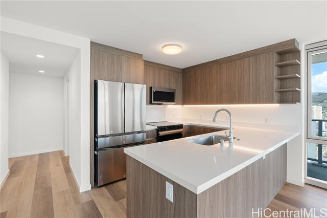 Brand new on the 40th floor! A spacious corner unit featuring 2 bedrooms/2 bathrooms/2 covered parking stalls, offering panoramic views of Diamond Head, the ocean, city skyline, and lush mountains. Enjoy floor-to-ceiling windows, an open layout filled with natural light, quartz countertops, luxury vinyl plank flooring, split AC in every room, a private lanai, and a separate laundry room. Convenient & central LOCATION—just minutes from beaches, fine dining, and entertainment, and only a few blocks from Ala Moana Shopping Center. The Park on Keeaumoku offers modern residences with exceptional resort-style amenities, including an infinity pool and spa, private cabanas, BBQ areas, a fitness center, movie theater, media room, co-working spaces, yoga room, and sauna. Experience the perfect blend of luxury and lifestyle in the heart of Honolulu.