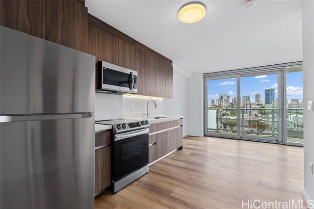 Welcome to The Park on Keeaumoku, a brand-new, modern community offering the best of urban living. This 391 sq ft studio features a private lanai for seamless indoor-outdoor enjoyment. The open layout is enhanced by floor-to-ceiling windows, luxury vinyl plank flooring, and quartz countertops. Enjoy resort-style amenities, including an infinity pool, fitness center, and media room. With a "Walker's and Biker's Paradise" score, the location is incredibly convenient. You are just moments away from Ala Moana Center, Walmart, and Sam's Club, with easy access to dining, shopping, and entertainment. This is city living at its finest. One or more photos have been enhanced.