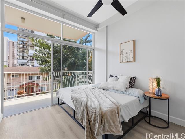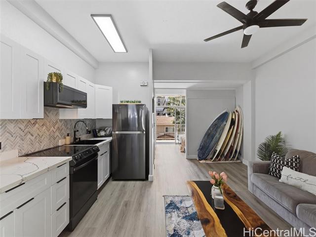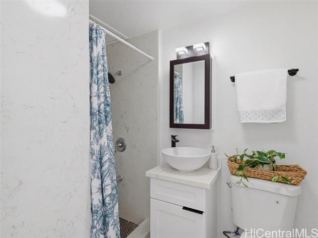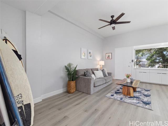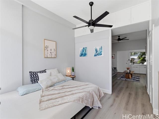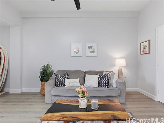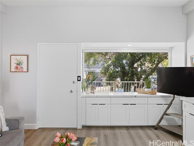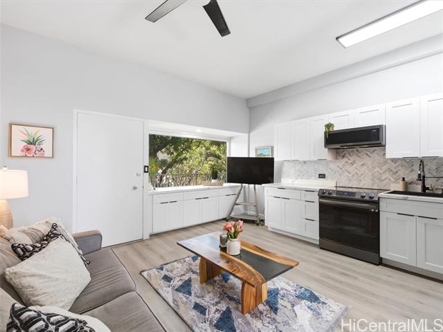 A complete renovation, prime location, and a full-size covered parking stall—this one checks every box. Experience the stunning upgrades of this beautifully renovated 1-bedroom gem in the heart of town. The kitchen sparkles with quartz counters, marble back splash, brand-new cabinets, and sleek black stainless steel appliances— including a large sink, refrigerator, stove/oven, and slim modern microwave. Open-concept with luxury vinyl plank flooring throughout. The bathroom has been fully refreshed with new fixtures, toilet, a renovated walk-in shower, and a stylish sink and faucet. Brand-new vinyl flooring, baseboards, lighting, and ceiling fans elevate the contemporary feel, while the freshly repainted interior creates a bright, inviting atmosphere. Every outlet, switch, and cover has been replaced for peace of mind. Enjoy the rare convenience of a covered, full-sized parking stall—hard to find in this area. Perfect for first-time buyers, medical professionals, students, or anyone seeking a move-in-ready home in Metro Honolulu. Don’t miss this opportunity to own a beautifully upgraded unit in an unbeatable location. Call for an appt now!