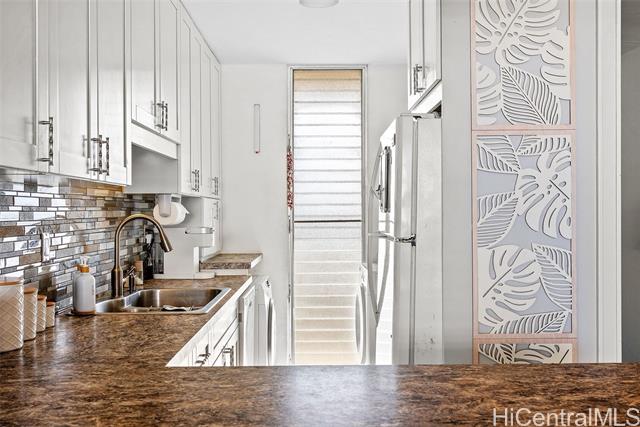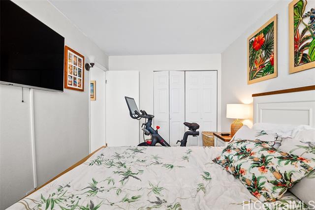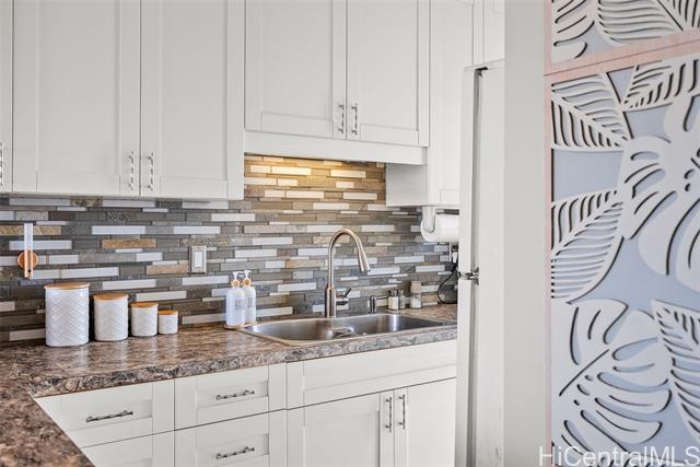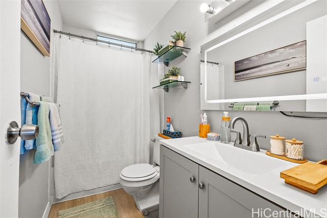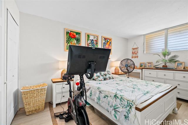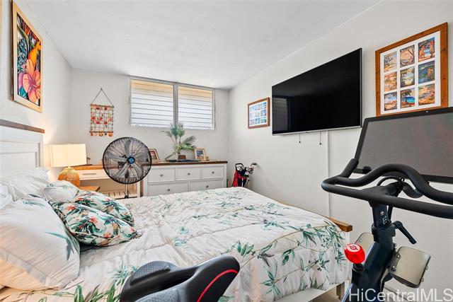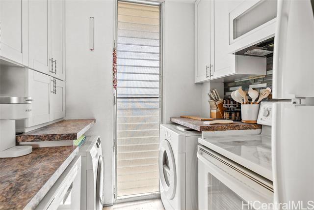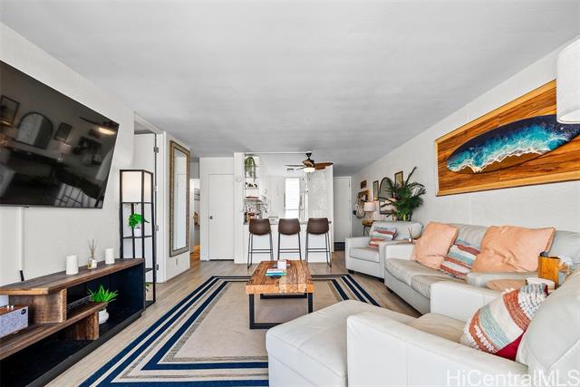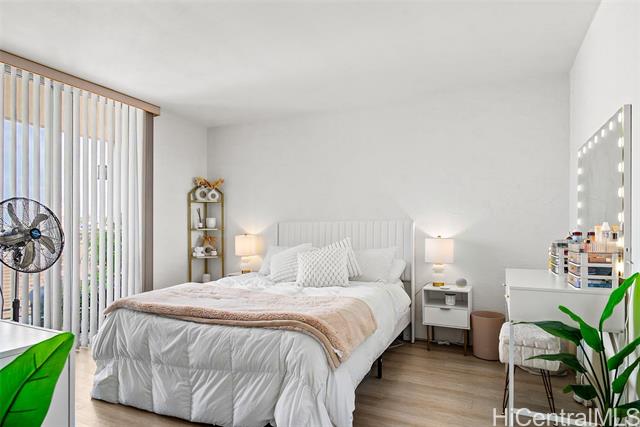 Recently upgraded furnished condo like a model home. Beautiful, tall white kitchen cabinets, nice appliances - including washer (new)/dryer in unit and dishwasher. Neutral decor and new luxury vinyl plank flooring. Enjoy the amazing 15th floor views of the mountains, Honolulu, and the Pacific. The covered lanai is the width of the condo with relaxation area and outdoor dining. Great value. It is a leasehold property and the lease expires in 2049. Everything is included! Curated local artwork, lovely leather living room furniture, beach essentials (chairs, umbrellas, snorkel gear). To access building there is a key entry, then a key entry to elevator area (both have call box for guest access). Programmable keyless entry for your front door. Wall mounted televisions. Check out the LED vanity mirrors in the bathroom and primary bedroom vanity. Building allows units to be rented, but the shortest term lease is 12 months. Perfect investment property - close to beach, easy access to H1, bases, hospitals. Also, an affordable way to buy Hawaii real estate as a primary or secondary home. Public OPEN HOUSE Sunday, Feb 22nd 1-4:00
