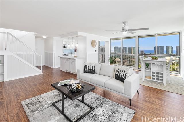 NEW PRICE! Urban living with panoramic views in the heart of Honolulu! Academy Tower off Ward Ave, a 26-story high-rise, offering residents a blend of city center convenience and breathtaking unobstructed panoramas of the Oahu skyline, the Pacific Ocean, and the surrounding mountains. Its location places residents at the nexus of urban amenities while maintaining a sense of privacy, with only two units per floor ensuring a more intimate living experience. Unit RGW occupy top 2 floors as grand penthouse with interior of expansive 3 bedrooms 3baths plus wraparound lanai. Total 2,370sq.ft. Low maintenance fee of $950/mo! And undergone complete floor to ceiling renovations in 2024 with spectacular views through floor-to-ceiling windows and sliding glass doors leading to wrap-around lanais. These outdoor spaces serve as perfect vantage points for enjoying warm-colored sunsets and twinkling city lights at night. Interior updates in brand new kitchen and baths, new split ACs, new flooring and new appliances and new patio sliding doors downstairs. Also Included walk-in storage unit! Available first time in 35 years and must see!