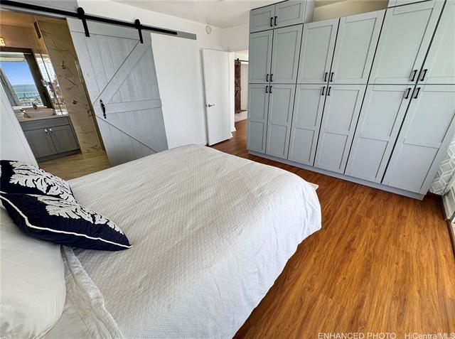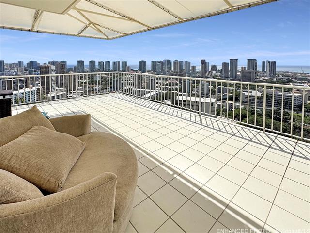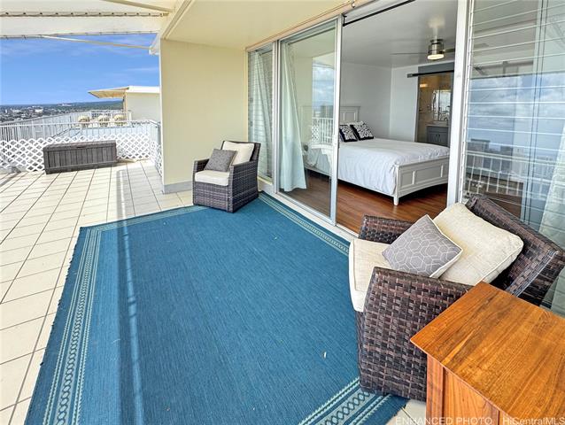 Welcome to Ka Hale Moi “The King’s Home”, a corner end Presidential Penthouse with sweeping city and ocean views. One of only two detached Penthouses, this rare offering delivers exceptional privacy, luxury, and true indoor/outdoor living. Enter into a bright, spacious living area with jaw-dropping vistas. Beyond the glass walls, step onto your massive 900+ sq. ft. lanai with wraparound awnings—perfect for entertaining, dining, or enjoying another stunning sunset. The chef’s kitchen features beautiful cabinetry, quartz countertops, elevated appliance package, and a breakfast bar that flows seamlessly to the outdoor covered dining area. The primary suite offers spectacular views, custom built-ins, a private patio, plus an ensuite bath. Two additional bedrooms include full-size closets and share a full hall bath. Enjoy central A/C, ceramic tile and luxury vinyl plank flooring throughout. Pet-friendly building offers secured elevators, a resort-style pool, and two covered parking stalls. Conveniently located near premier shopping, dining, entertainment, with easy freeway access. HOA includes high-speed internet, hot water, cable, sewer, water, on-site management and security.