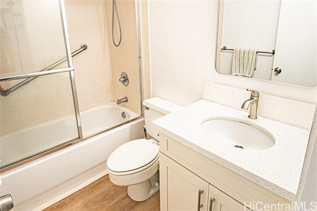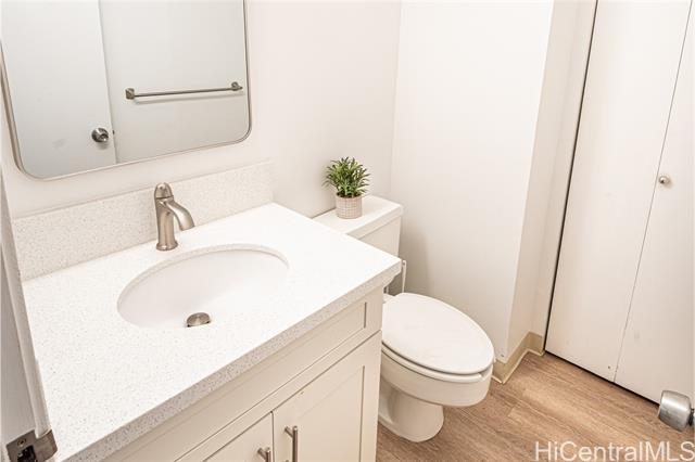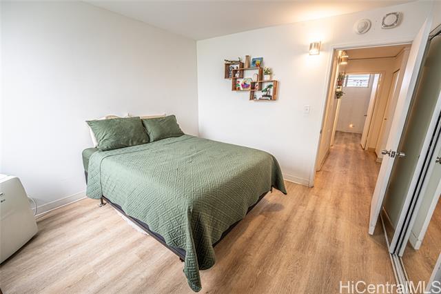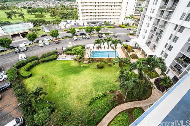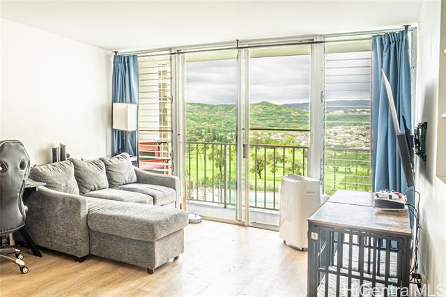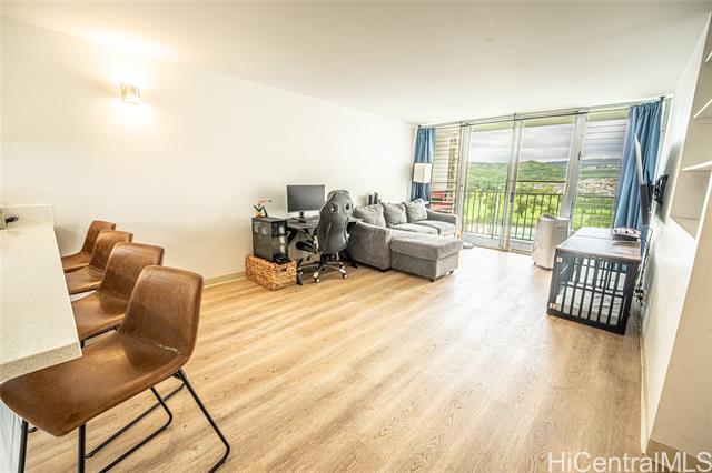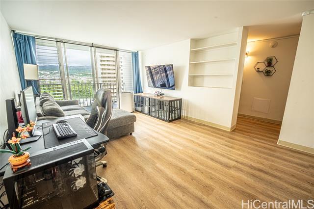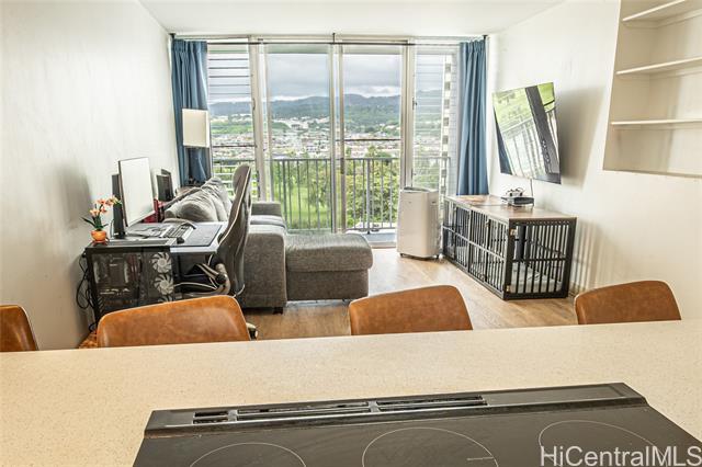 Just 10-15 minutes from Fort Shafter and Joint Base Pearl Harbor–Hickam, this modern 2-bedroom, 1.5-bath high-rise residence offers exceptional convenience with easy access to the airport, freeway, shopping, and dining. Inside, the home has been thoughtfully upgraded with warm-toned modern luxury vinyl plank flooring, creating a clean feel throughout. The kitchen is both stylish and functional, featuring sleek quartz countertops, a large sink, upgraded modern faucet, and stainless steel appliances. Bathrooms have been tastefully updated with cohesive finishes, and an in-unit washer and dryer adds everyday ease. Step onto a spacious lanai and take in sweeping mountain views paired with stunning sunset skies—an ideal setting to unwind at the end of the day. Maintenance fees includes electricity and cable for added value and convenience. Enjoy 1 assigned open parking stall, plus community amenities including a swimming pool, BBQ area, and walking path, offering great spaces to relax and unwind without leaving home. Highly secured building with on-site front desk management. Move-in ready and well-suited for both owner-occupants and investors. Schedule your showing today!