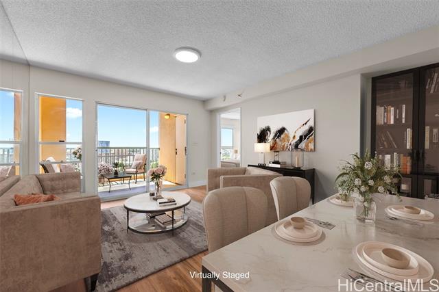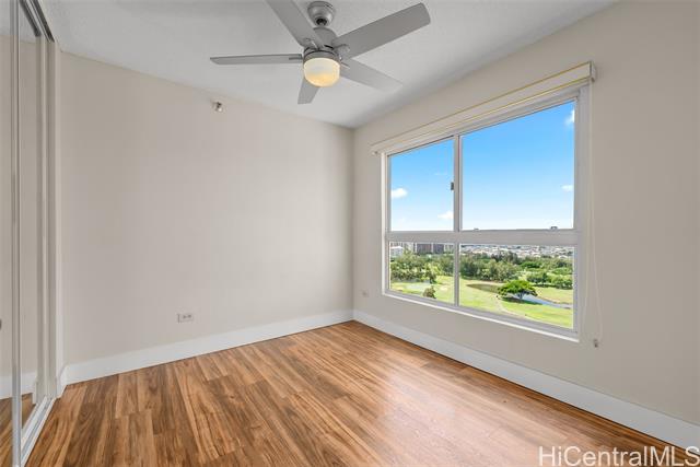 Enjoy resort living with easy access to the freeway, Tripler Hospital, Airport, Fort Shafter, Pearl Harbor and Hickam. From the moment you step through the gate of this preferred end unit, you'll be captivated by panoramic Golf Course & Mountain views, with historic Tripler Hospital visible in the distance. Inside, the renovated kitchen features a breakfast bar & ample space for an eat-in area, flowing seamlessly into the dining and living areas. The open-concept living space flows to a covered lanai with Ocean & Golf Course views, perfect for al fresco dining, morning coffee, or unwinding after a long day. The primary suite features tranquil mountain and golf course views along with the beautiful twinkling lights of distant buildings at night, bath with tub, a walk-in closet, and a secondary closet. This spacious home truly blends comfort and convenience! Country Club Village is a pet-friendly community offering fantastic amenities such as a pool, BBQ areas, walking paths, and abundant guest parking, making it ideal for entertaining. VA approved, 100% hurricane coverage and 2 side-by-side covered stalls.