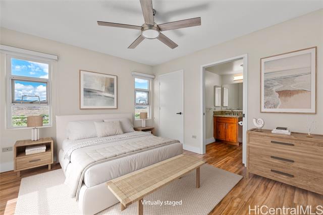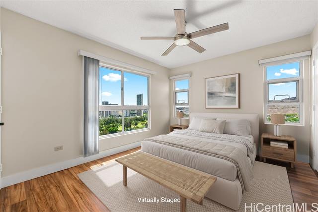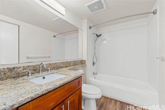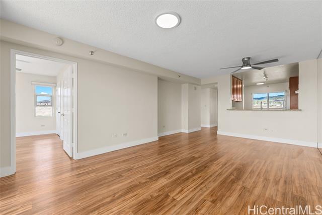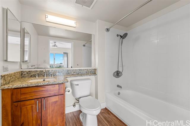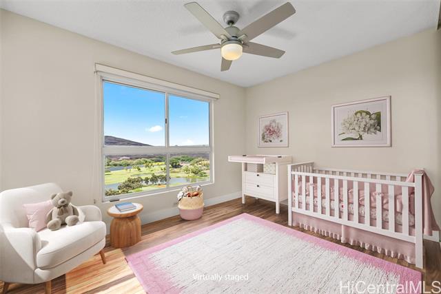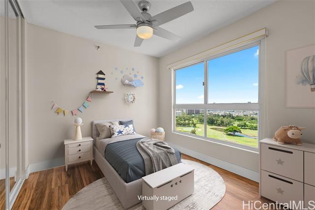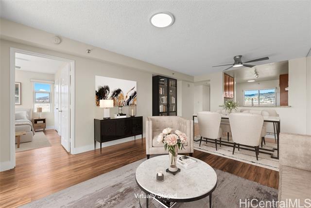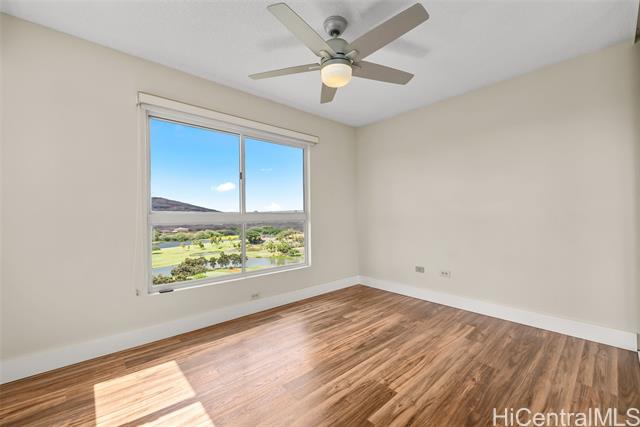 Enjoy resort living with easy access to the freeway, Tripler Hospital, Airport, Fort Shafter, Pearl Harbor and Hickam. From the moment you step through the gate of this preferred end unit, you'll be captivated by panoramic Golf Course & Mountain views, with historic Tripler Hospital visible in the distance. Inside, the renovated kitchen features a breakfast bar & ample space for an eat-in area, flowing seamlessly into the dining and living areas. The open-concept living space flows to a covered lanai with Ocean & Golf Course views, perfect for al fresco dining, morning coffee, or unwinding after a long day. The primary suite features tranquil mountain and golf course views along with the beautiful twinkling lights of distant buildings at night, bath with tub, a walk-in closet, and a secondary closet. This spacious home truly blends comfort and convenience! Country Club Village is a pet-friendly community offering fantastic amenities such as a pool, BBQ areas, walking paths, and abundant guest parking, making it ideal for entertaining. VA approved, 100% hurricane coverage and 2 side-by-side covered stalls.